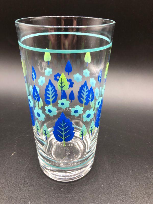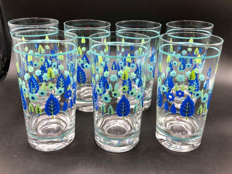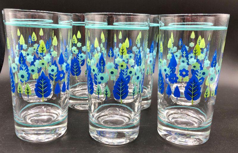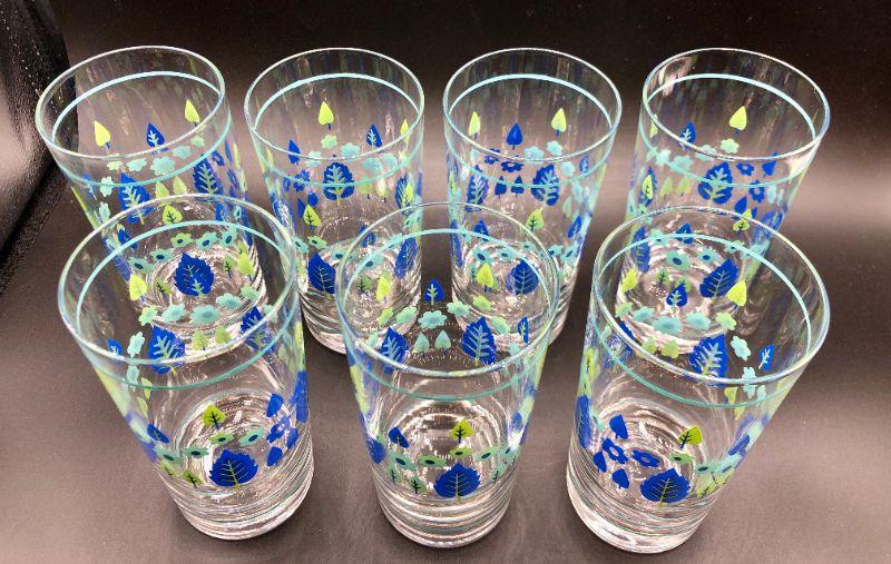 Set of 7 vintage drinking glasses. Shades of blue design. Pattern is flowers and trees. Good vintage condition. Pattern & colors are vibrant.