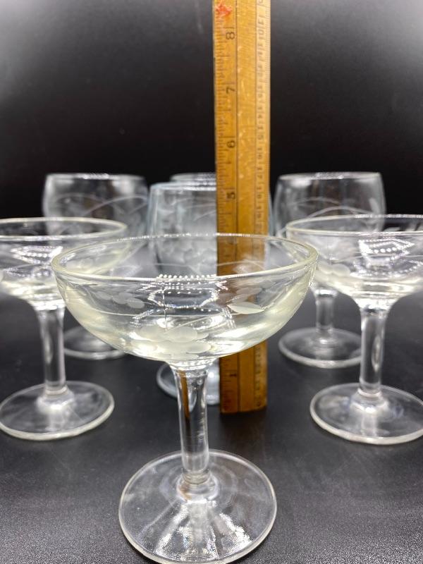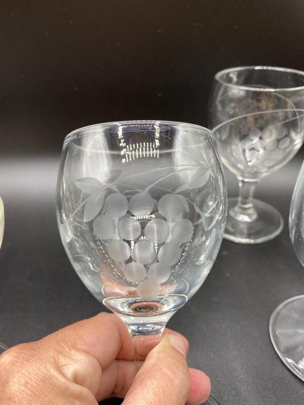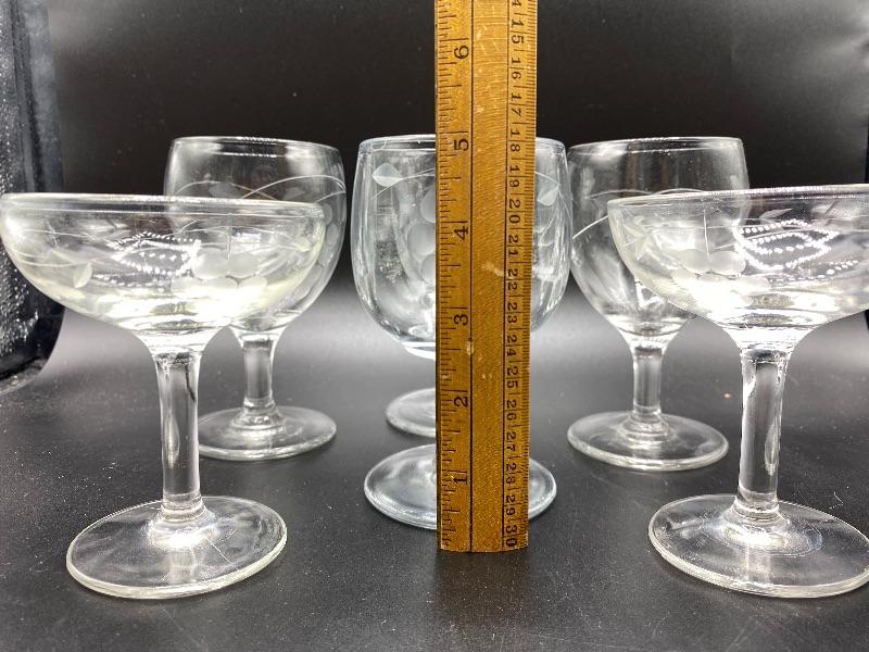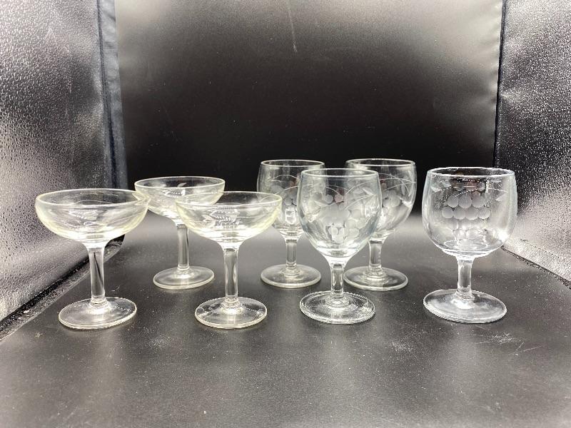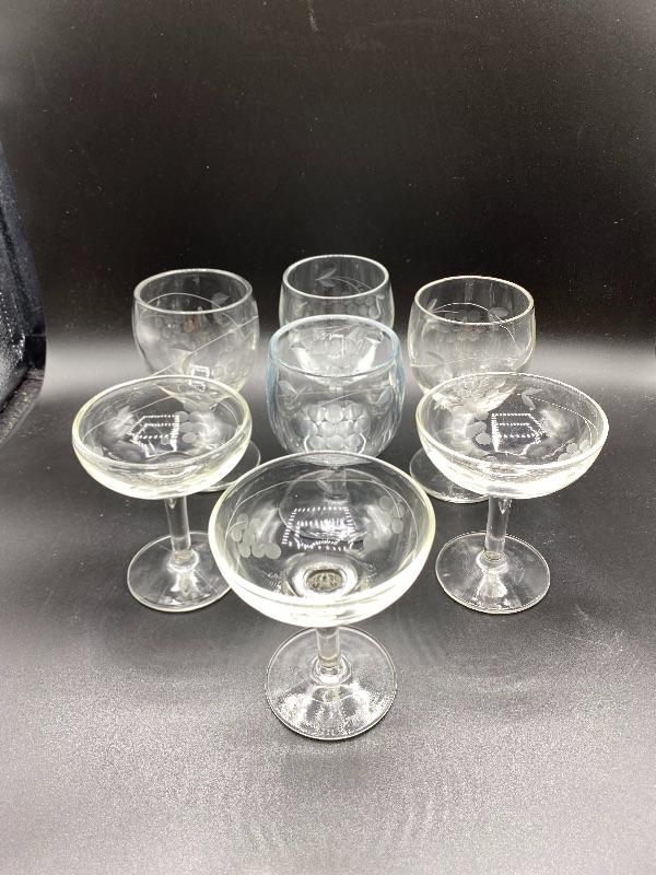 Set of 7 grape pattern drink glasses. 4 small wine goblets and 3 champagne glasses. Thick glass. 5" and under in size. No chips.