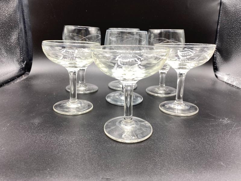 Set of 7 Grape Etched Goblets and Champagne Glasses