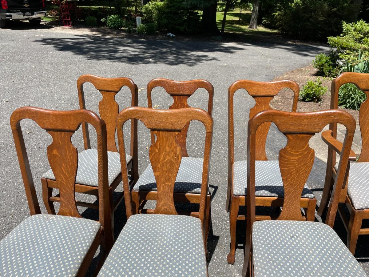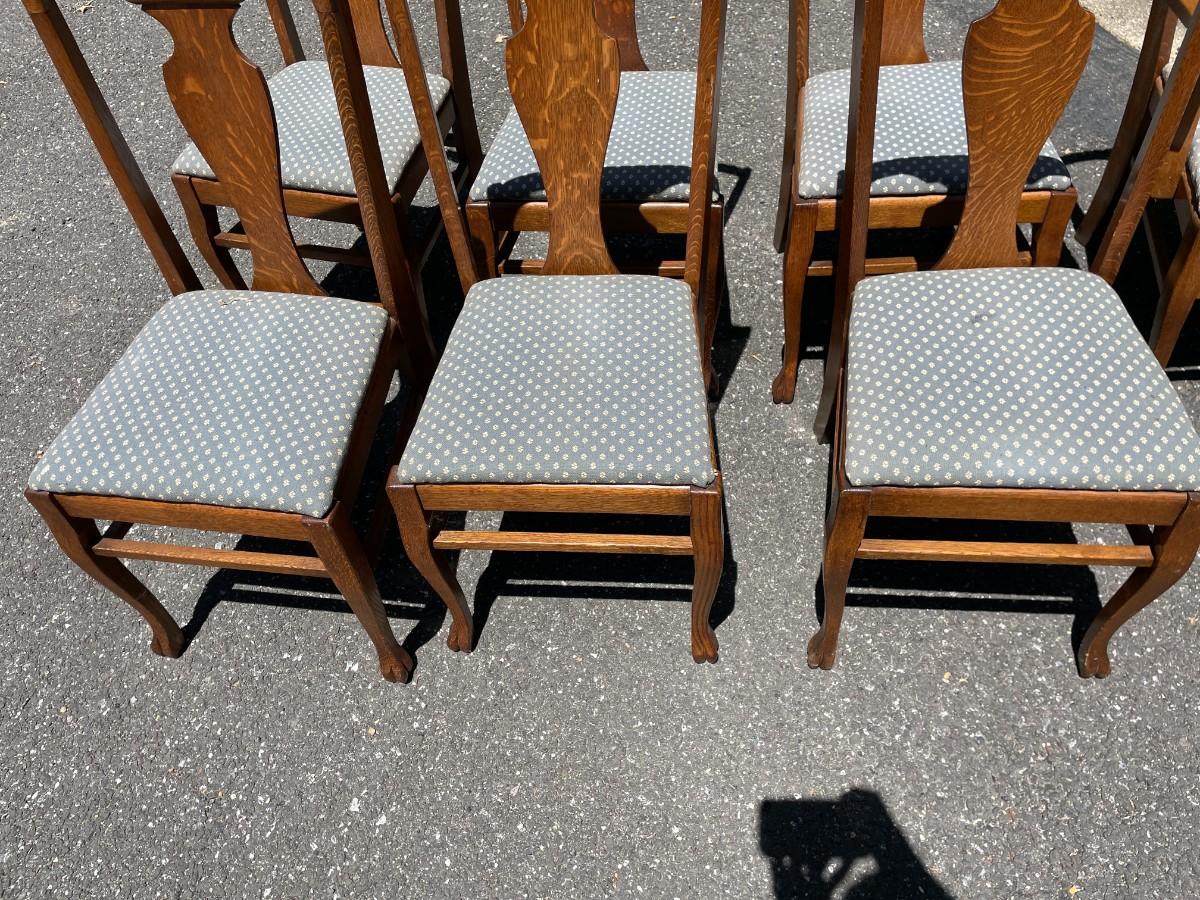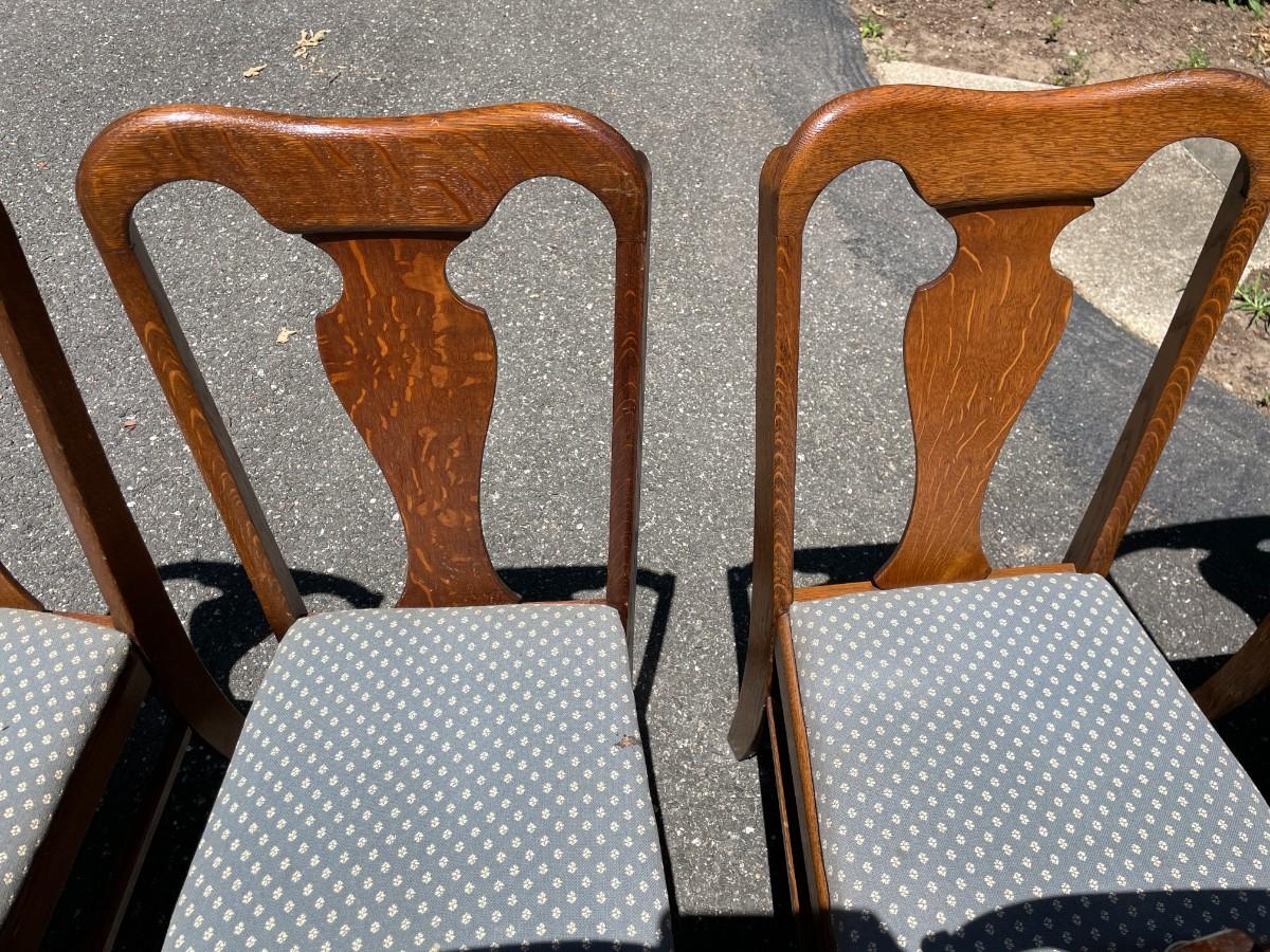 These dining chairs are sturdy and in beautiful condition. A few spots on the upholstery of a couple of the chais.