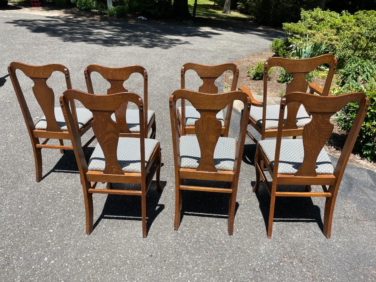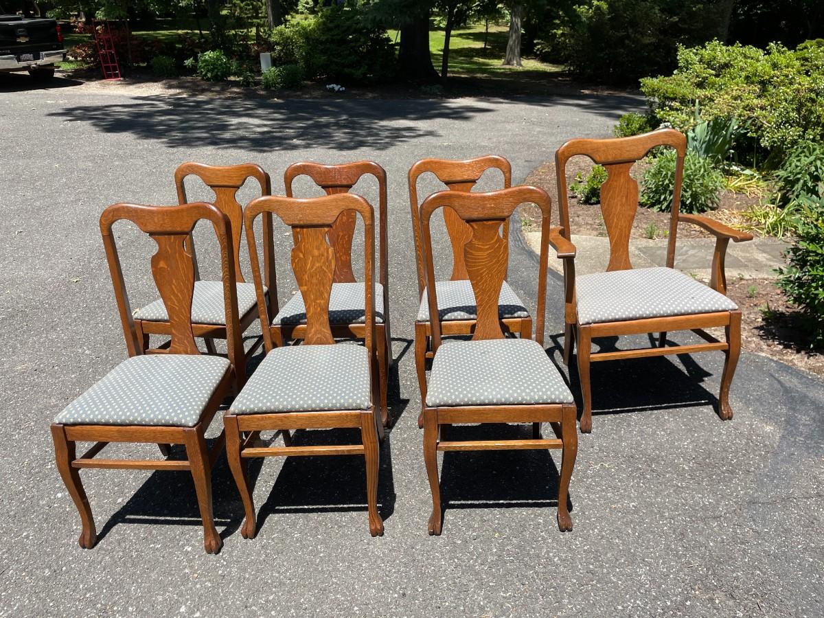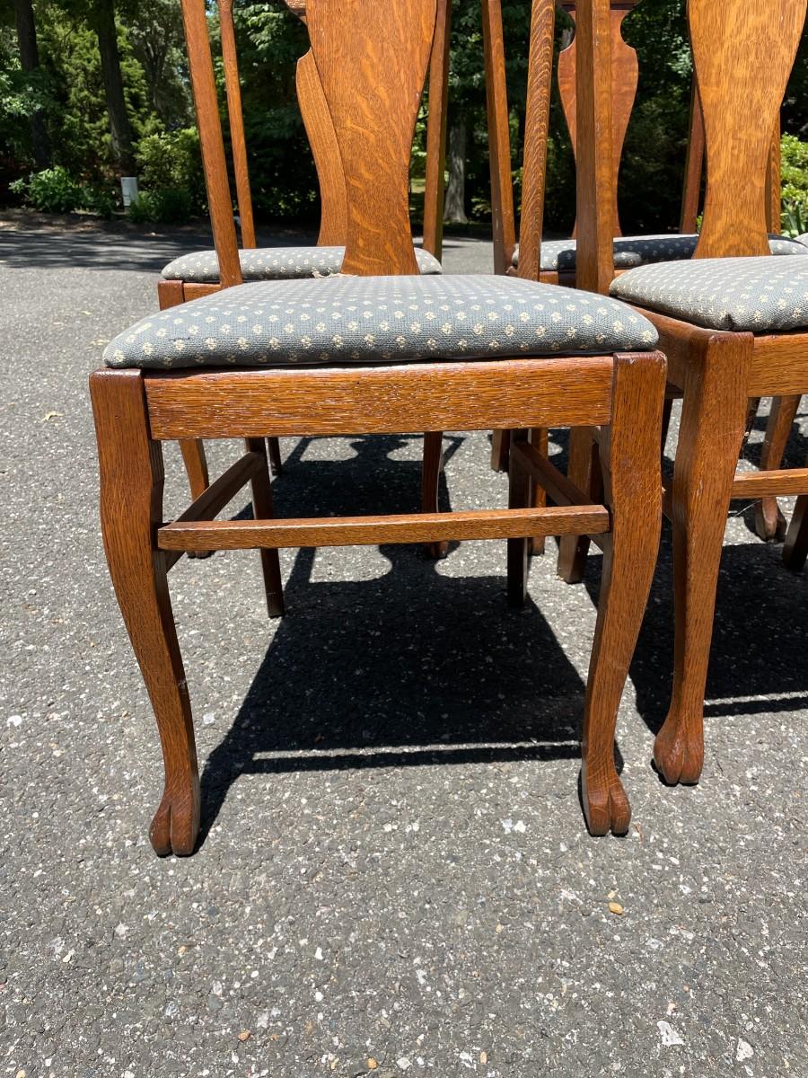 These dining chairs are sturdy and in beautiful condition. A few spots on the upholstery of a couple of the chais.