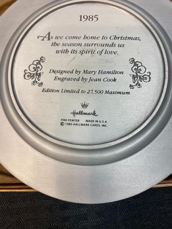 Set of 7 vintage Hallmark Christmas pewter plates. Limited edition plates, all but 2 have their original boxes. Years included are 1977, 1978, 1979, 1983, 1985, 1986, 1987. All are marked on the back side. About 6" size.