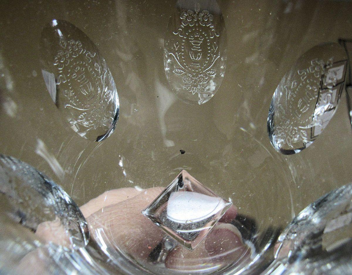 Very nice shape. Was very hard to photograph to get the image to show. There are 6 oval medallions of urns of flowers throughout the bowl of the stem. The white specks are just dust, sorry. All clear, no gold trim.