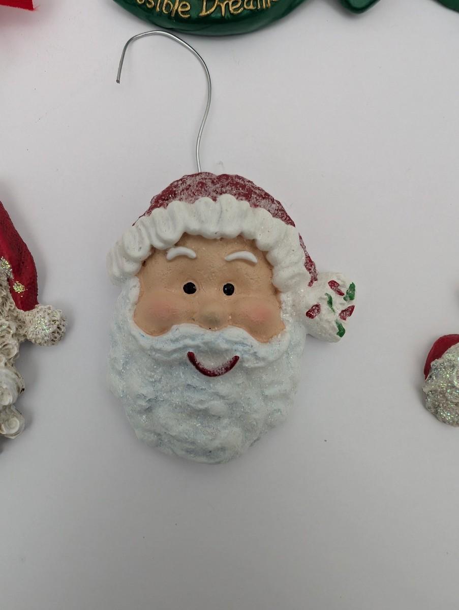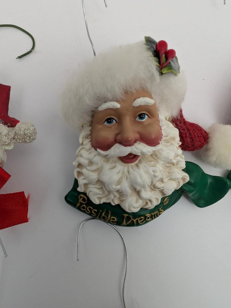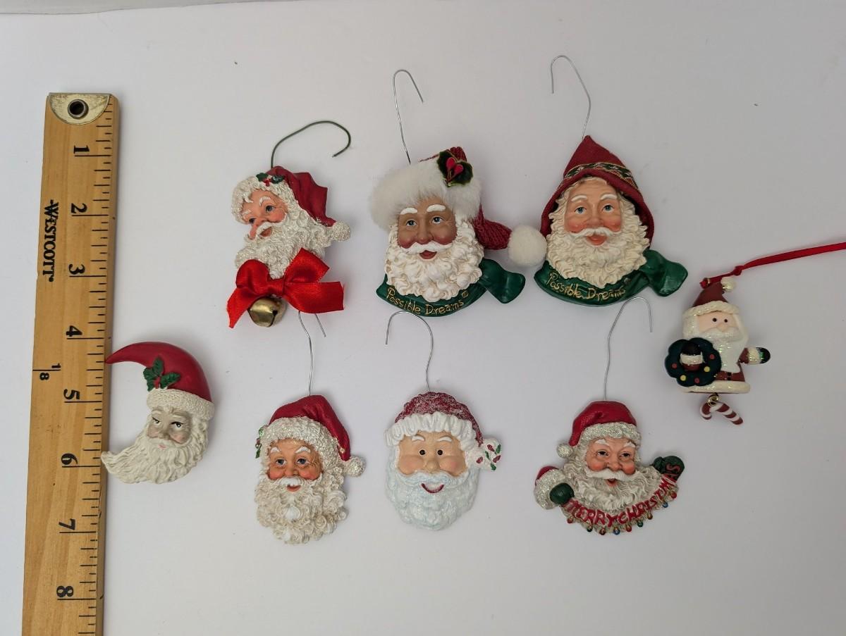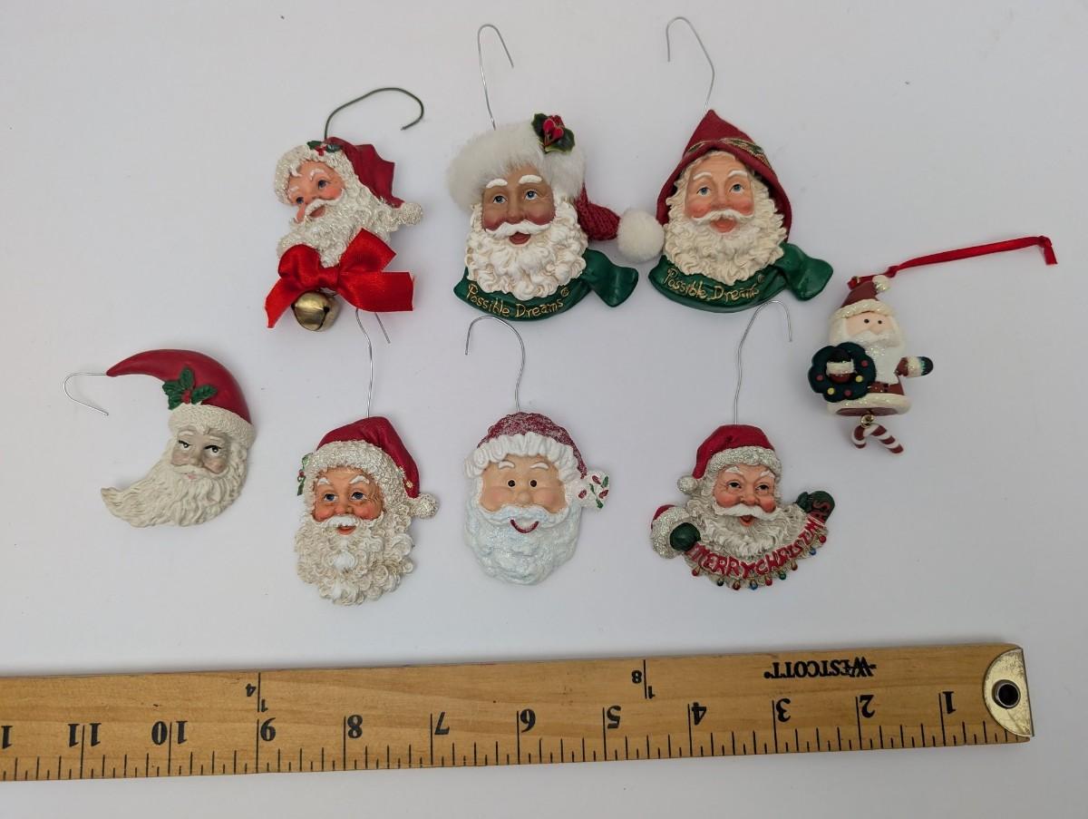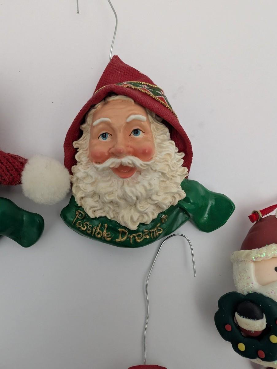 This festive lot includes 7 assorted Santa Claus ornaments each with its own unique charm and personality. Designs range from classic Santa faces to full-bodied figures including two marked Possible Dreams. Some feature glitter accents jolly expressions and festive holiday details. Perfect for filling your Christmas tree with vintage-inspired spirit or adding to your Santa collection.