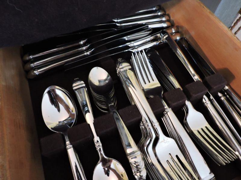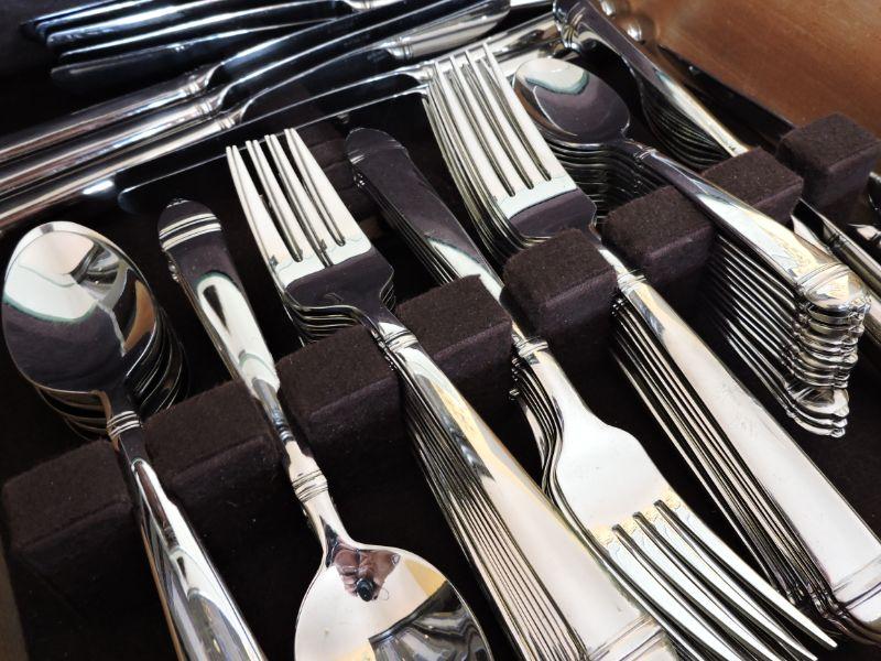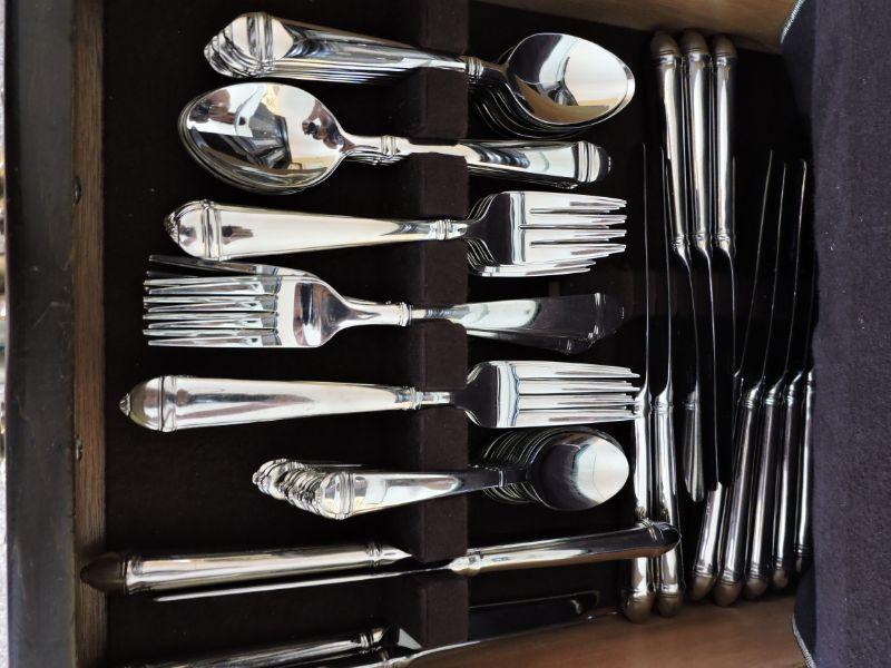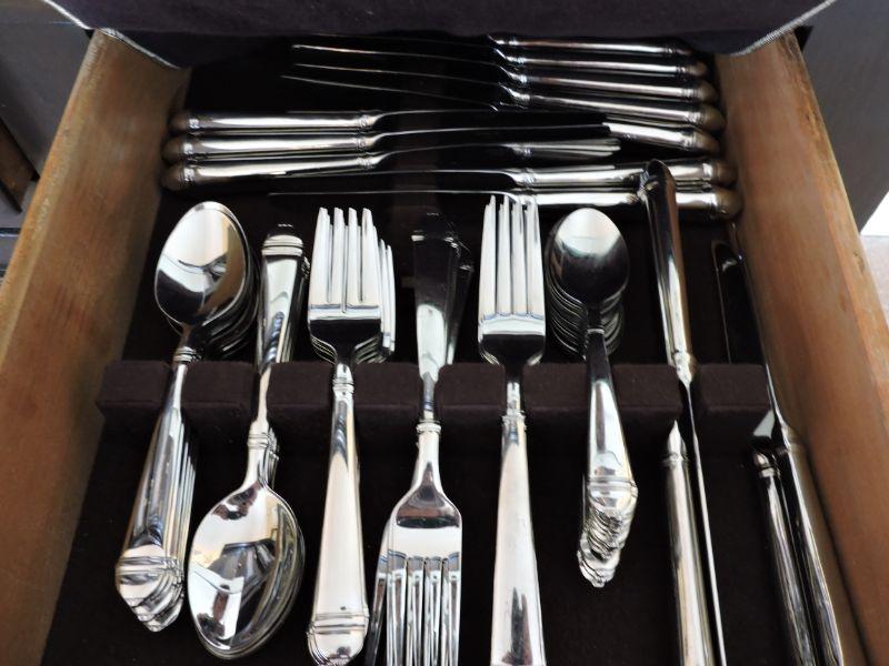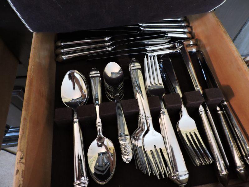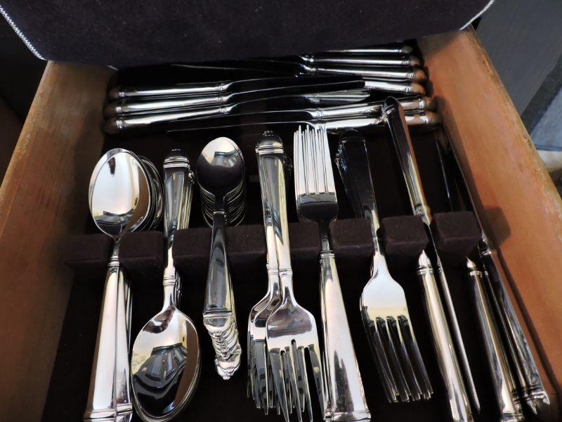14 Knives, 15 Dinner Forks, 15 Salad Forks, 15 Small Spoons, 16 Soup Spoons. 75 Pieces total. Pattern retired in 2000. 5 piece replacement sets sell for $40. **Please read Terms and Conditions before placing a bid. Pick up is Wednesday, September 25 from 4pm to 7pm and Saturday, September 28 from 9am to 1pm in Williamstown, NJ. All sales are final. All sales are as is, where is. Please review all photos. Any props included in photos are not included in listing. All measurements are approximate.