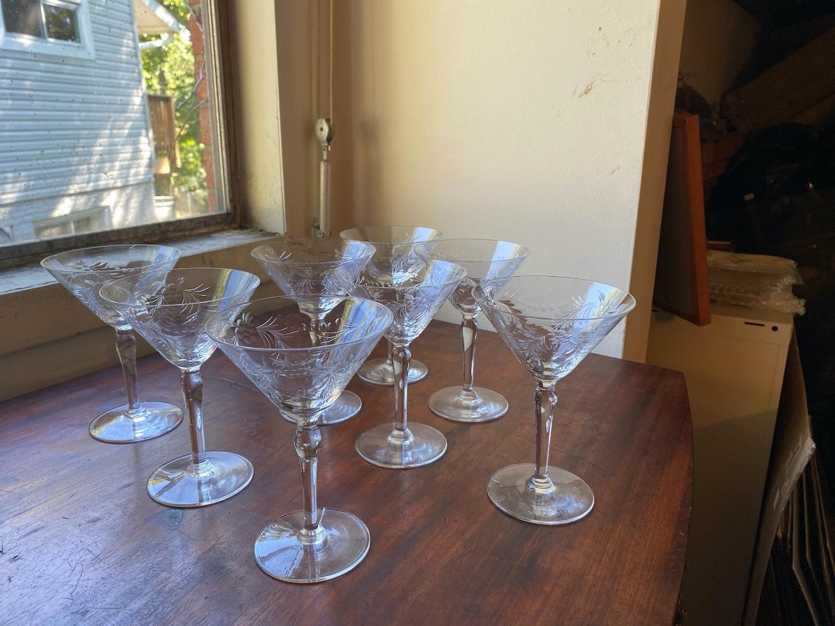 8 *5 7/8” wineglasses from 1920s by HAWKES in the lovely Avalon pattern with flowers and swags. Excellent clean crisp condition.