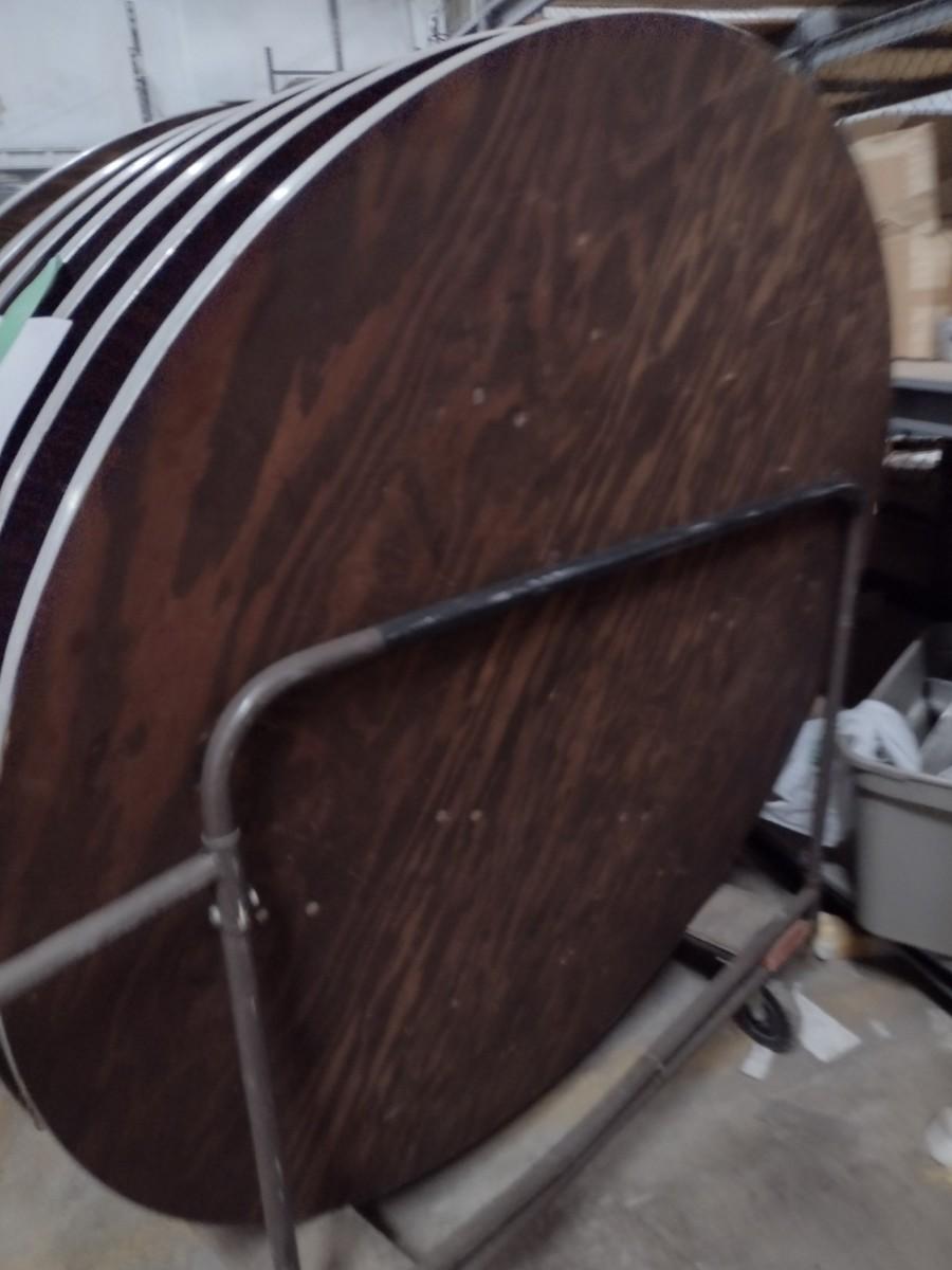 Set of 8 Commercial Grade King Arthur Folding Leg 60" Round Event Tables Choice E may have some wear or scratches to the surface. Roll racks are not included. Shipping option via freight or local mover is Buyer's responsibility and expense. Buyer must have all shipping scheduled within the stated dates and times of pickup. Recommended local mover is Beaty Bros. Moving 828-201-2982