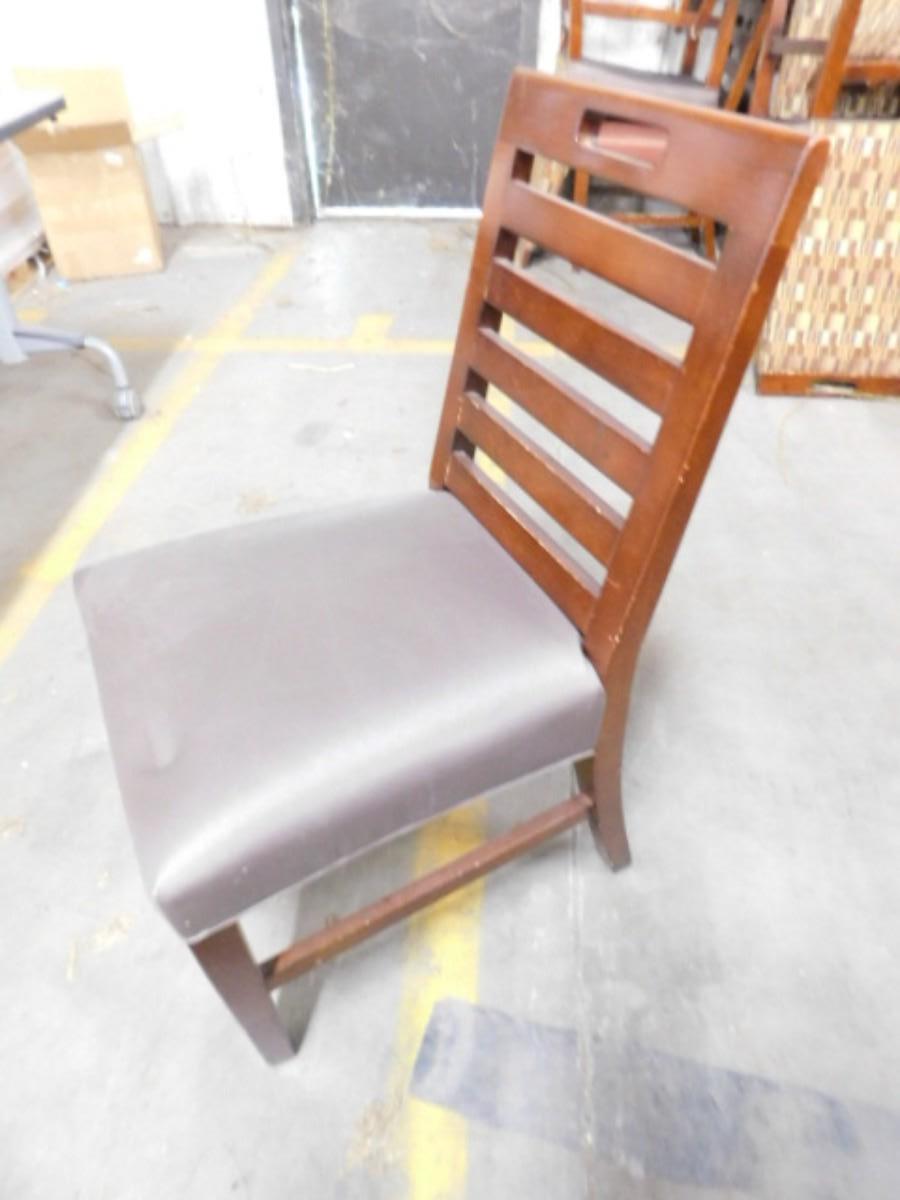 Set of 8 Commercial Grade Dining Chairs with Gray Vinyl Covered Seats and Wood Slat Back Choice E may have scratches or wear