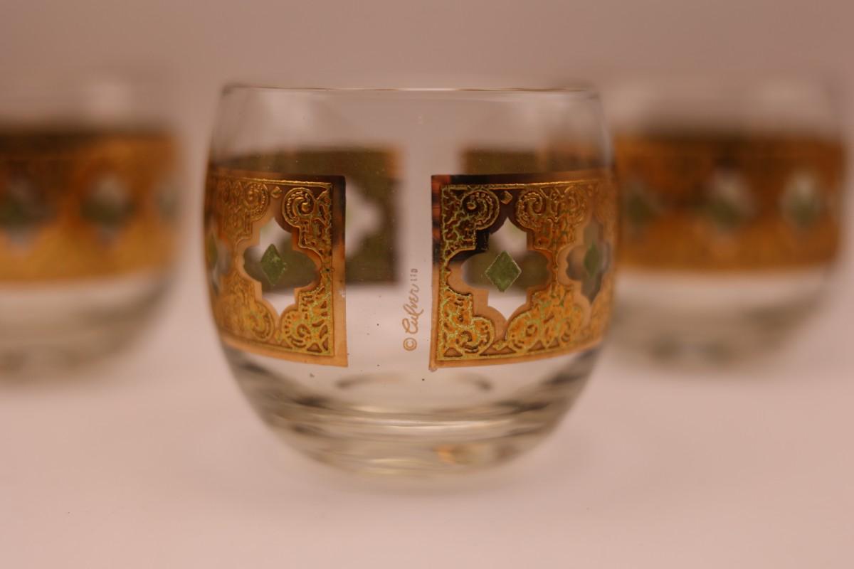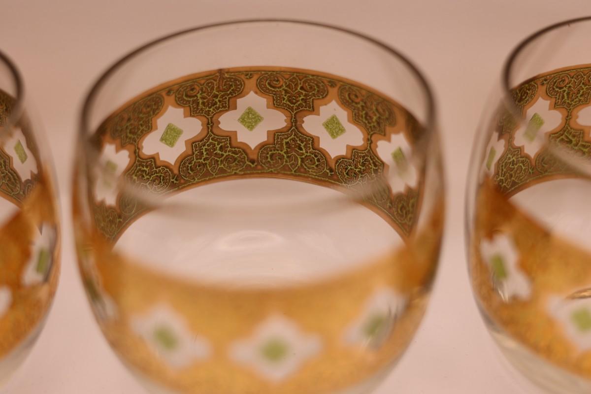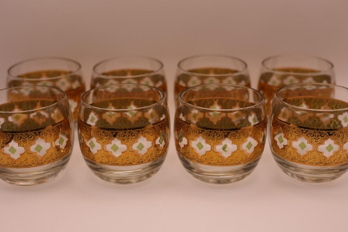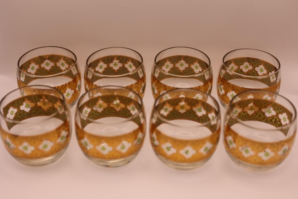 Set of eight Culver lowball glasses with gold and green geometric pattern. Light wear consistent with normal use.