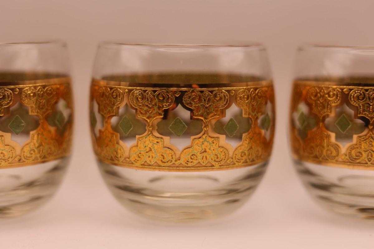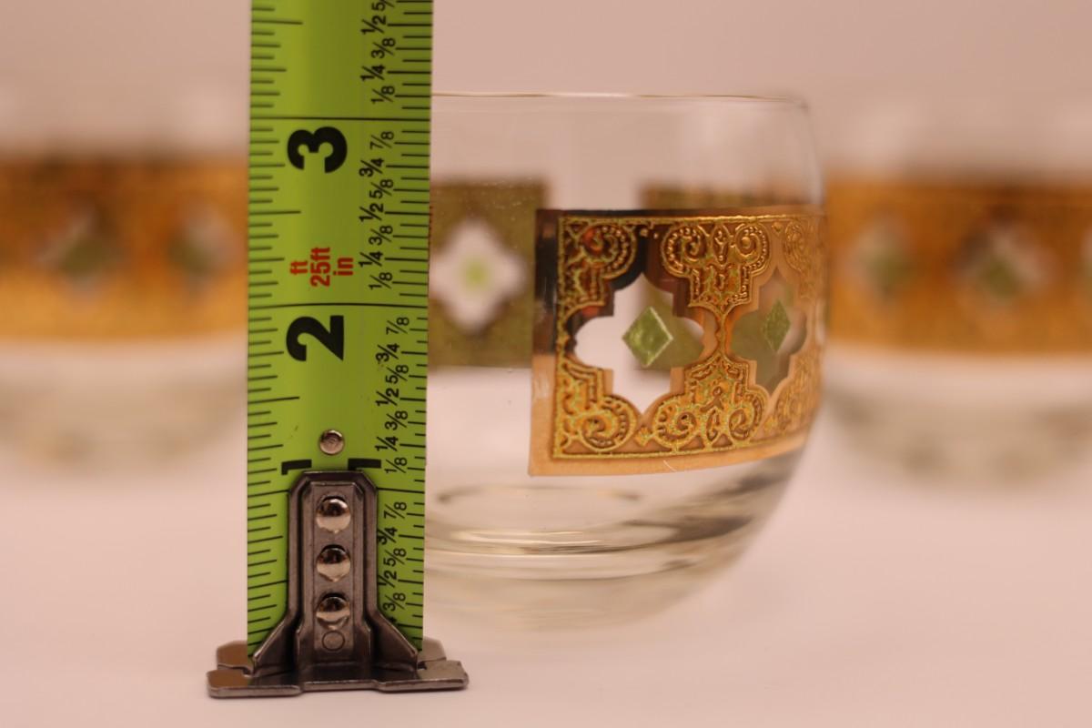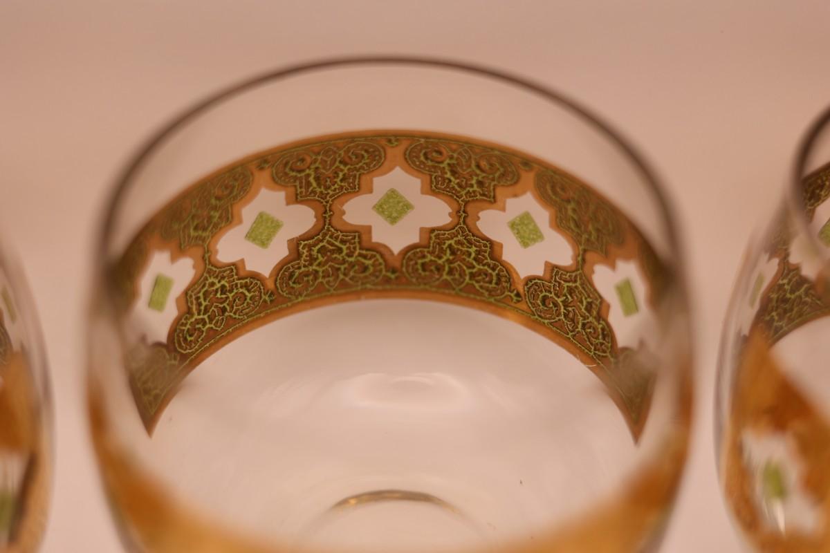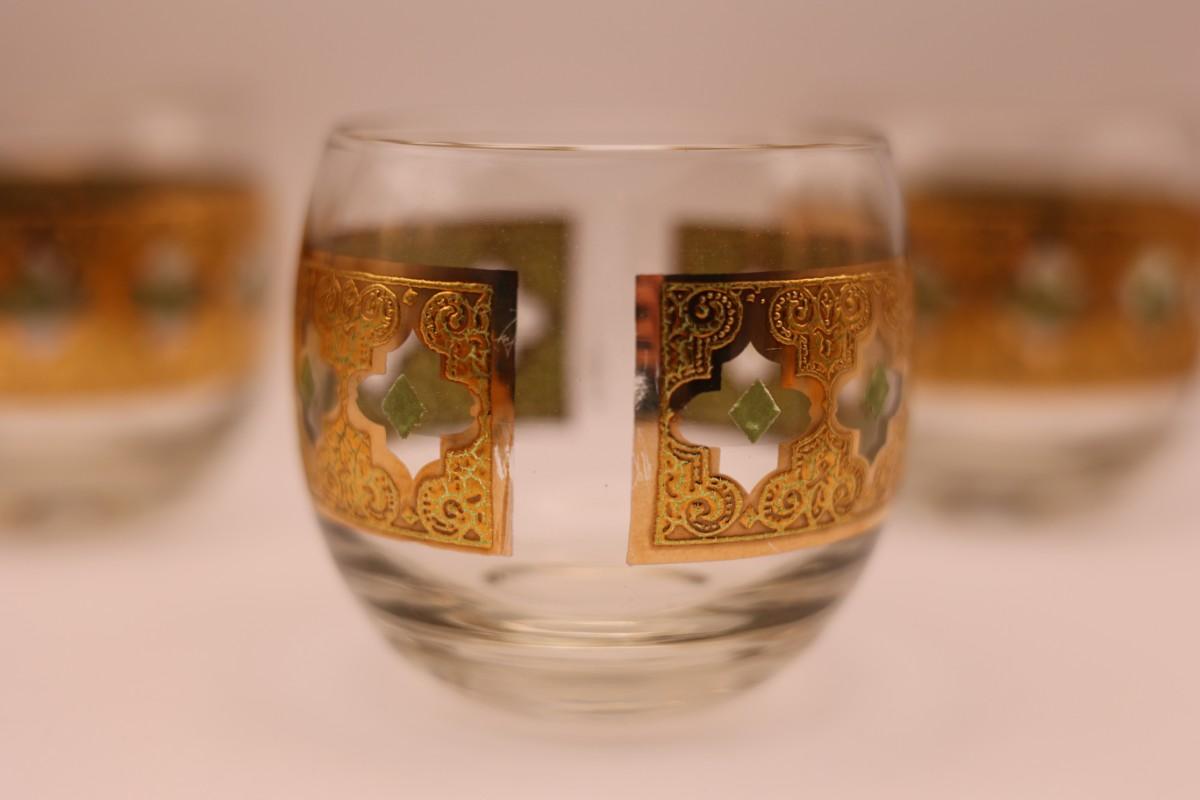 Set of eight Culver lowball glasses with gold and green geometric pattern. Light wear consistent with normal use.