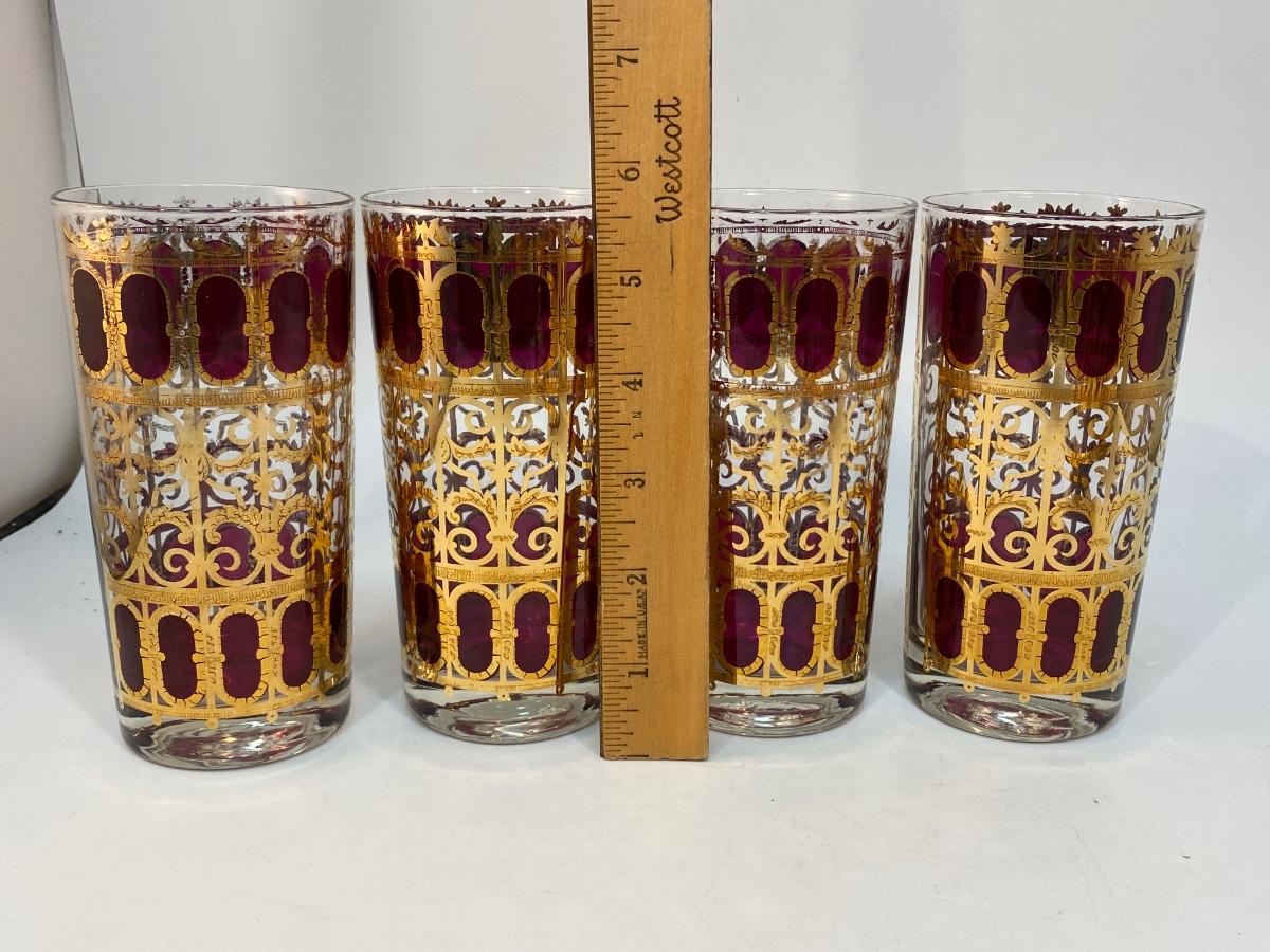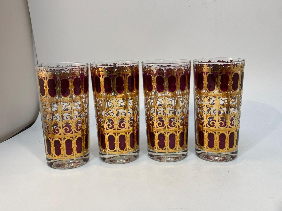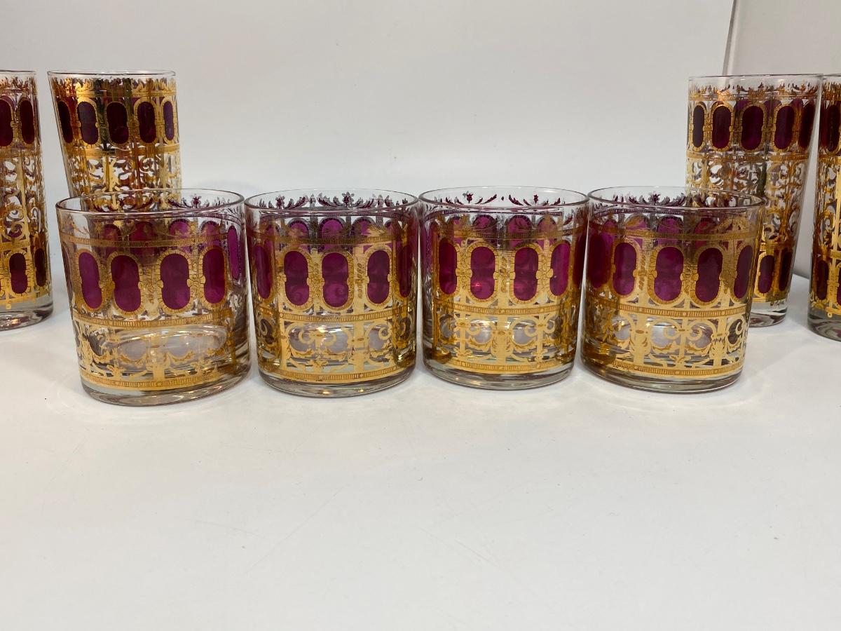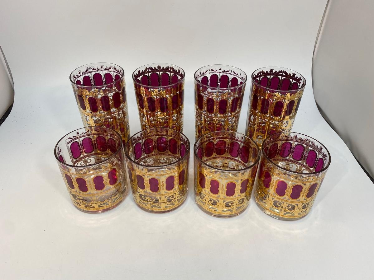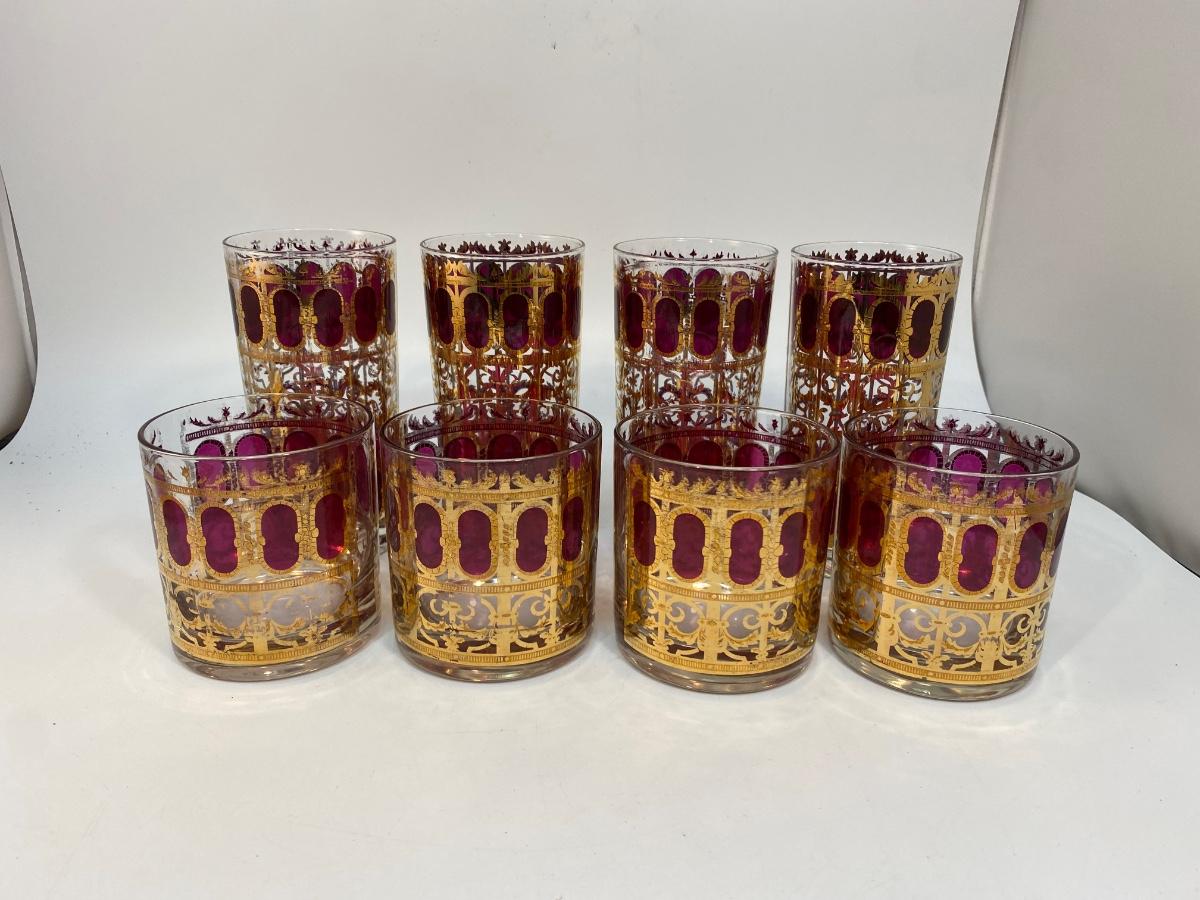 Set of 8 Culver Mid Century MCM Cranberry Scroll Red & Gold Barware Drink Glasses. 4 highball glasses and 4 lowball glasses. Some wear to the pattern, more on some glasses than the others. No chips.