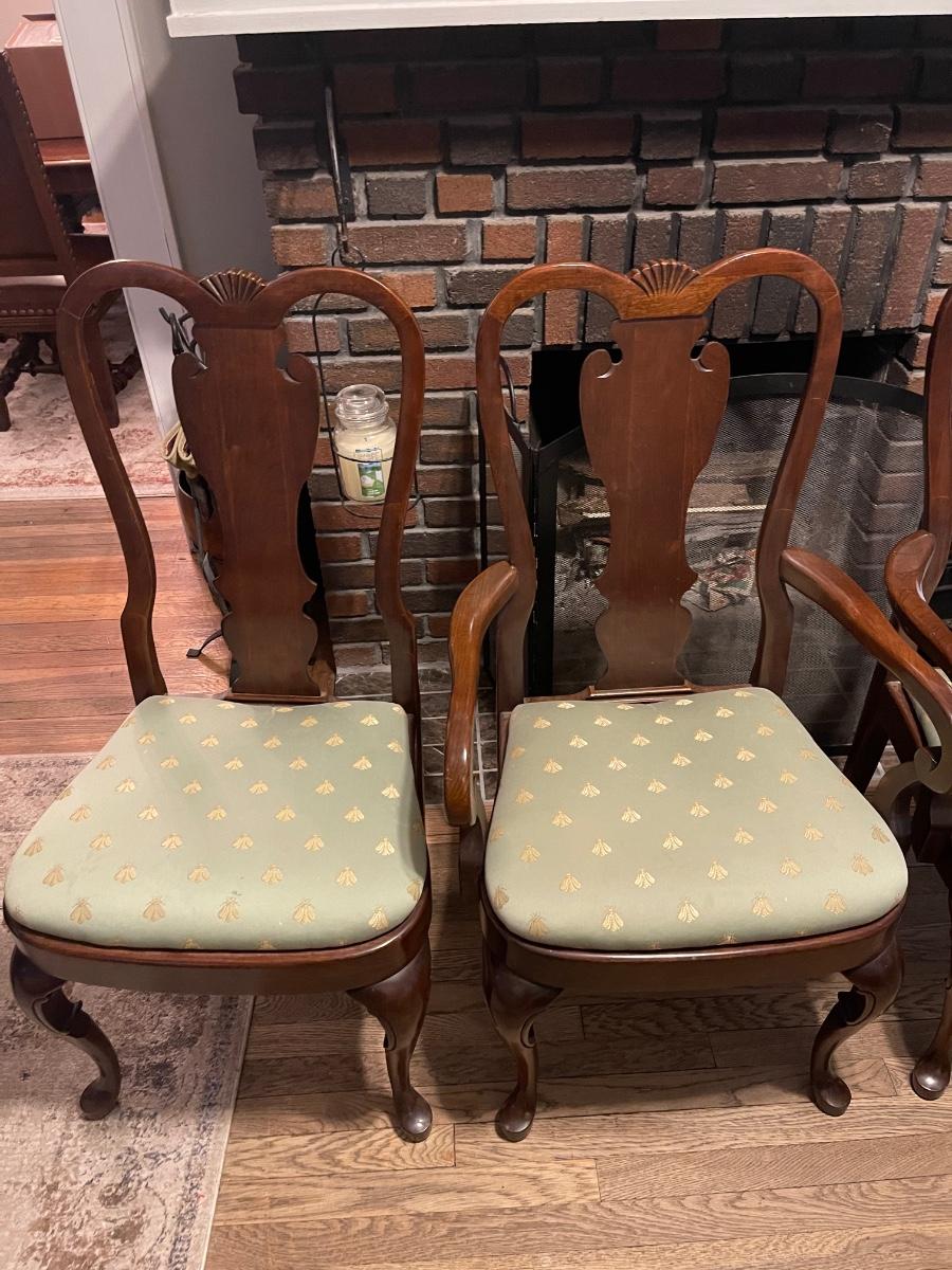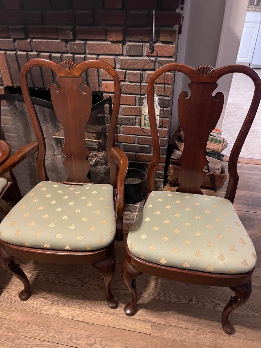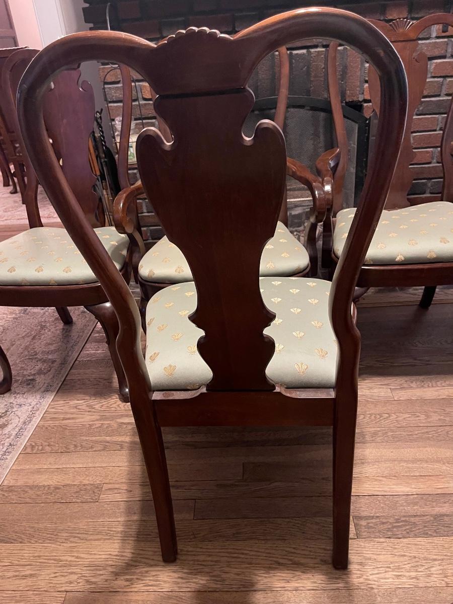 Set of 8 dining chairs. Two arm chairs and six side chairs. These are used. I would say these are in good to fair condition, depending on the chair. The cushions could use a recovering, and one side chair needs a little reinforcement. There is one paint droplet on one of the side cushions, and one of the arm chair cushions need some reinforcement as well. If the cushions were covered this, so it would be in very good condition. Other than that this is a great set, especially if you entertain.