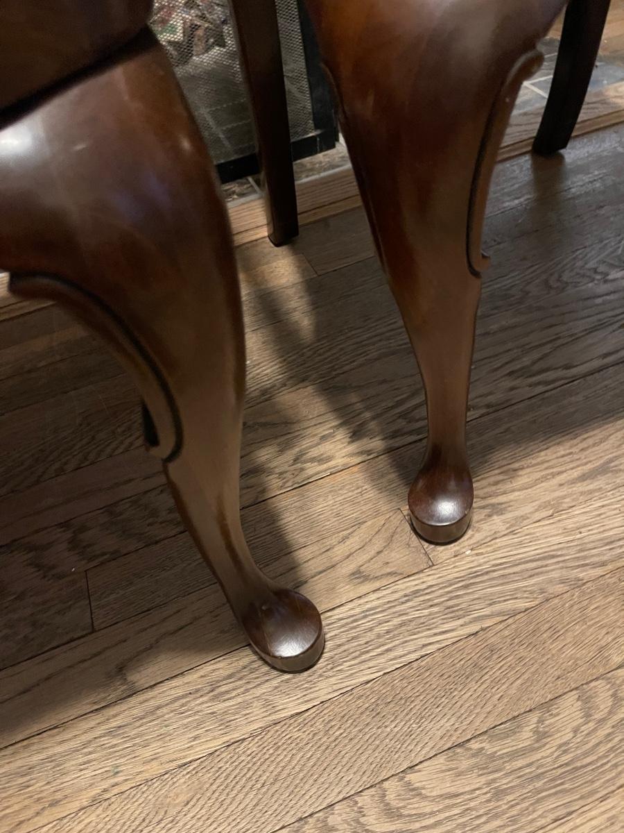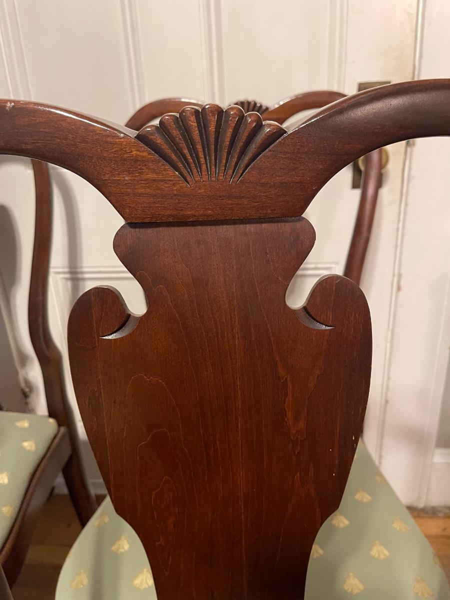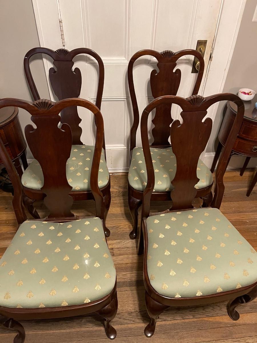 Set of 8 dining chairs. Two arm chairs and six side chairs. These are used. I would say these are in good to fair condition, depending on the chair. The cushions could use a recovering, and one side chair needs a little reinforcement. There is one paint droplet on one of the side cushions, and one of the arm chair cushions need some reinforcement as well. If the cushions were covered this, so it would be in very good condition. Other than that this is a great set, especially if you entertain.