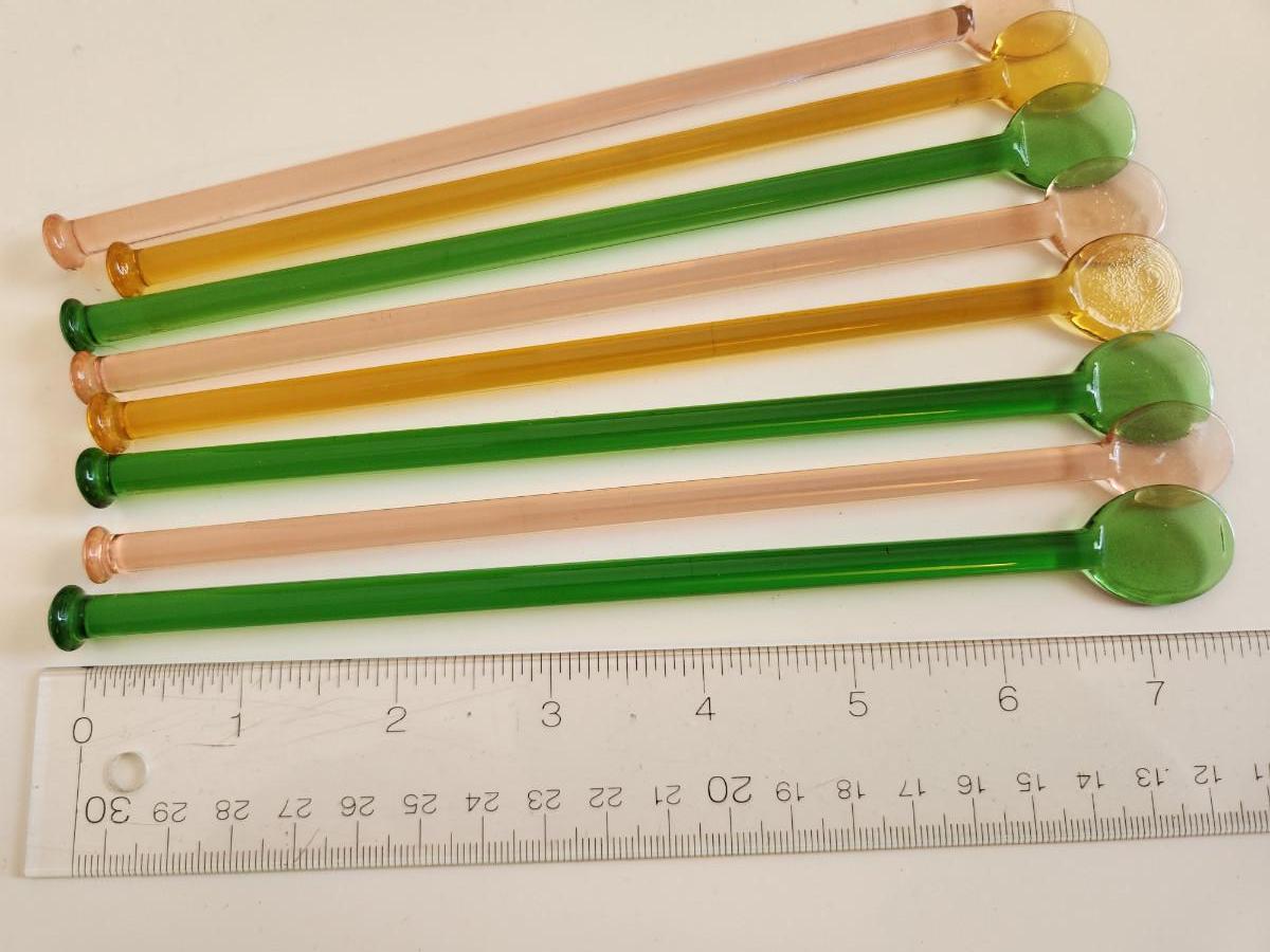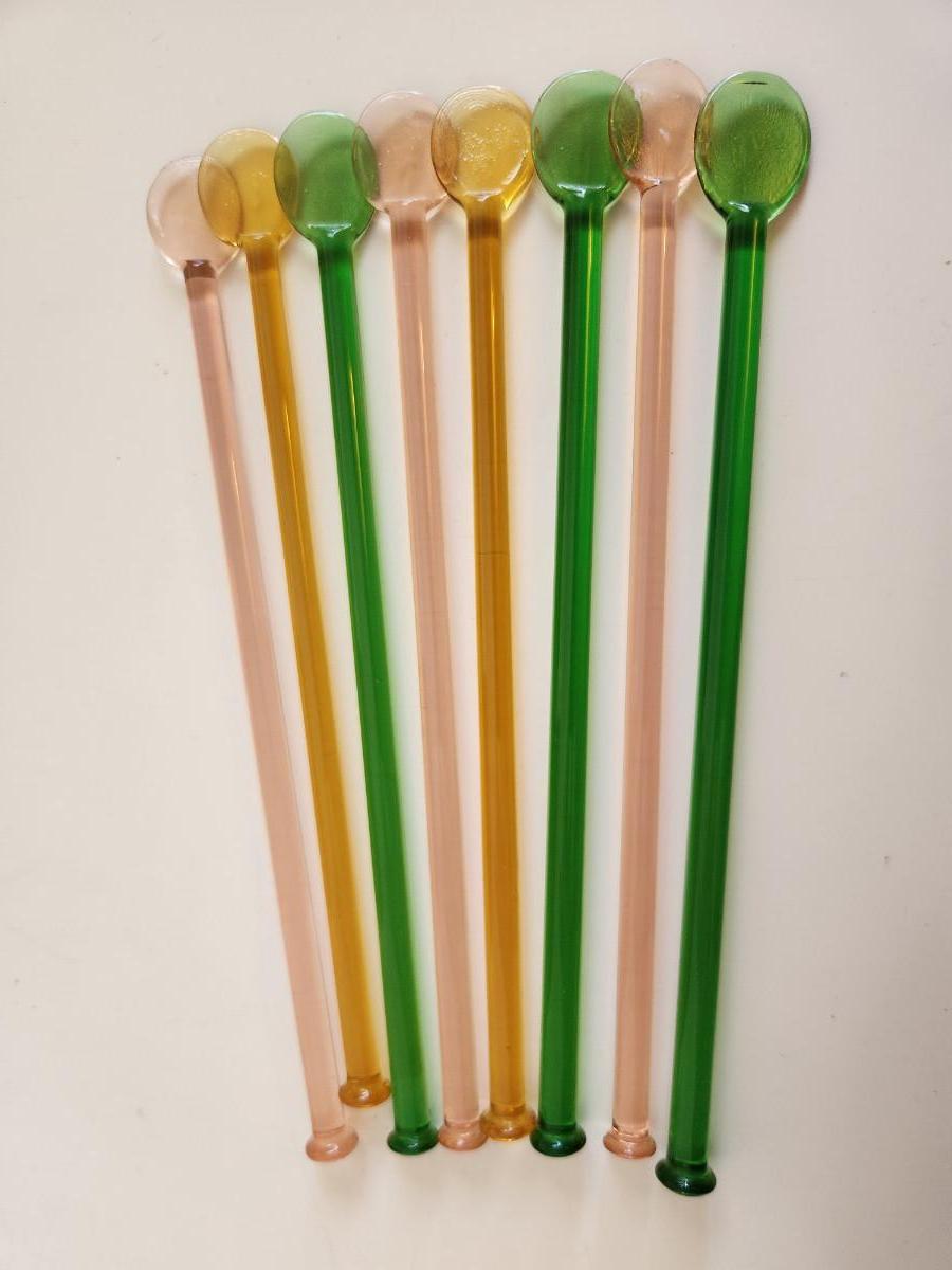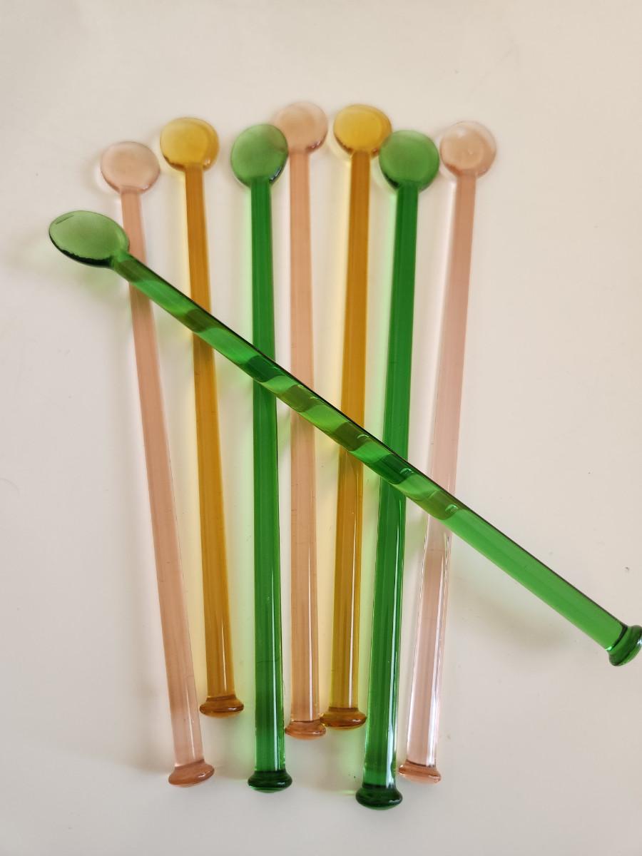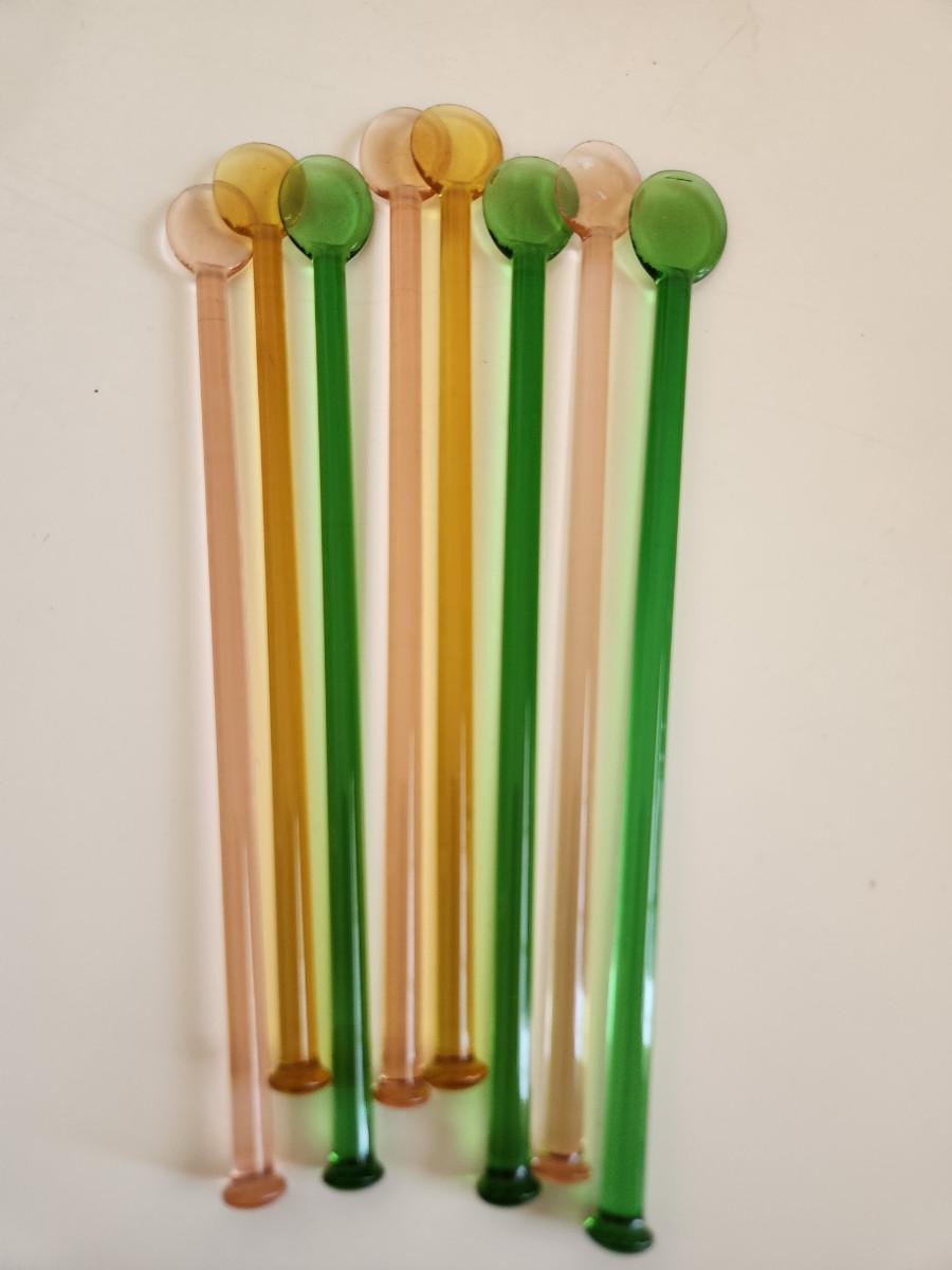 This lot is for a Set of 8 Glass Cocktail Stirrers. This colorful set contains stirrers in green, pink and orange. Great for so many purposes - especially stirring that 5PM cocktail.