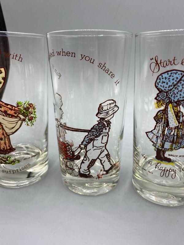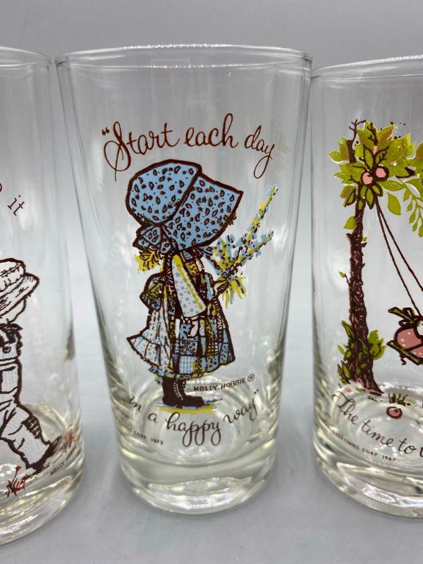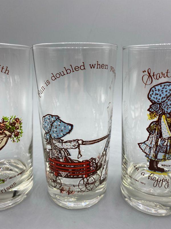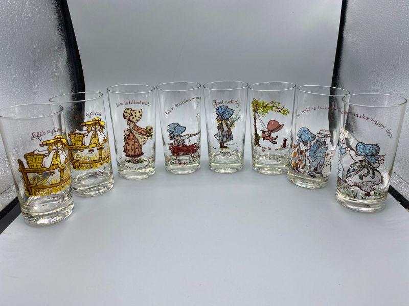 Set of 8 vintage Holly Hobbie drink glasses. 7 different designs, one is a duplicate. Great condition, little to no signs of use and wear. Stand about 5.5". There is dates on the glasses, late 60s into the 70s but actual release date is unknown.