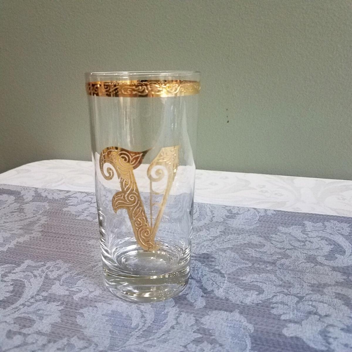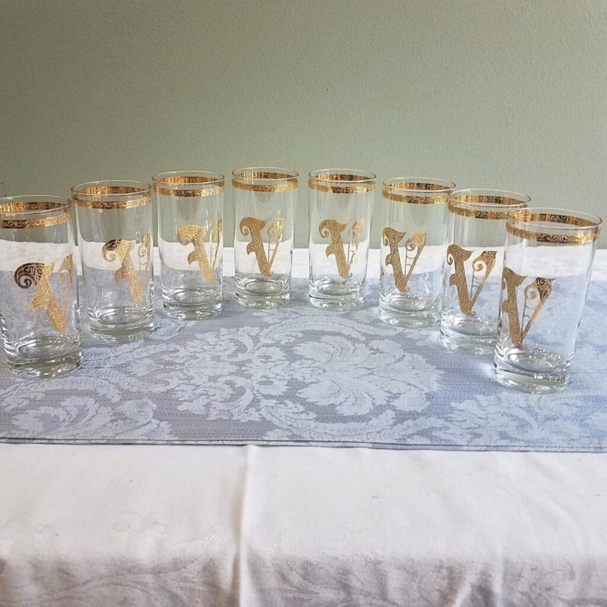 Set of 8 MCM bar glasses trimmed in gold, monogrammed with a “V”. 5.5”h x 2.75”w. In very good vintage condition, no chips or cracks, do not see any paint loss