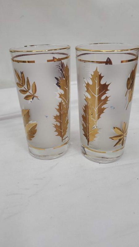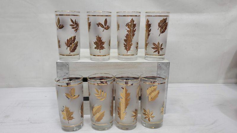 Set of 8 Mid Century Libby Gold Leaf Drinking Glasses, Carrier Rack, Vintage