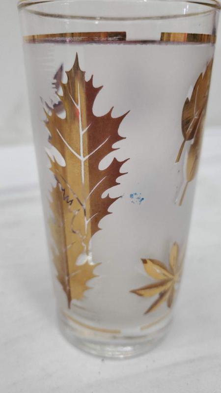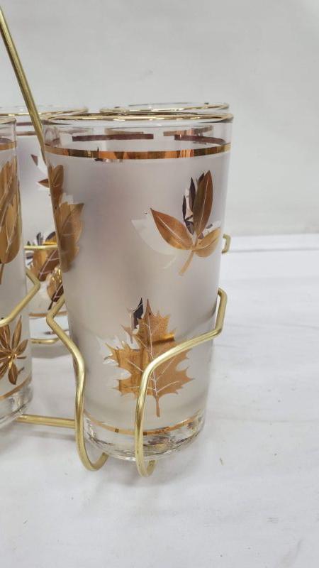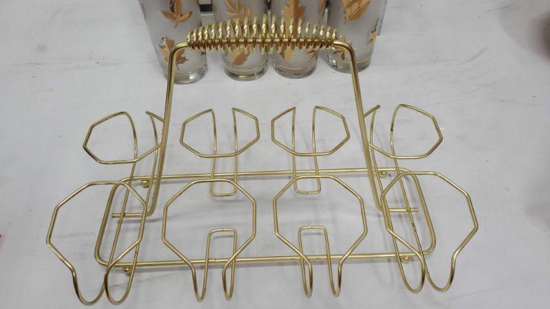 Set of 8 Mid Century Libby Gold Leaf Drinking Glasses, Carrier Rack/Caddy, Vintage, A Few have Little Blue Marks