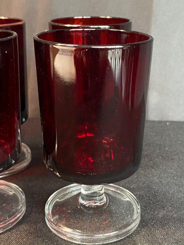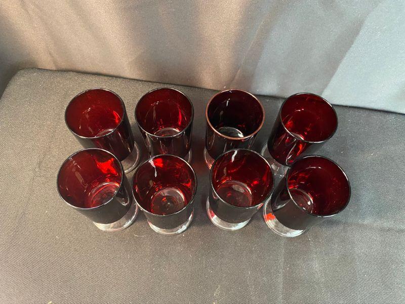 Set of 8 Ruby Red Juice Glasses. Clear stem and base. Great Condition, no chips. Made in France.