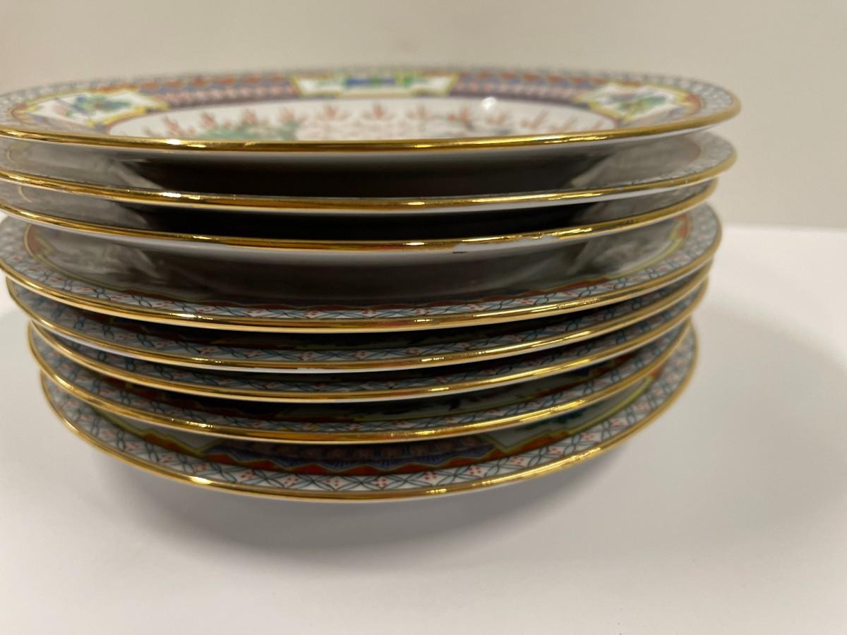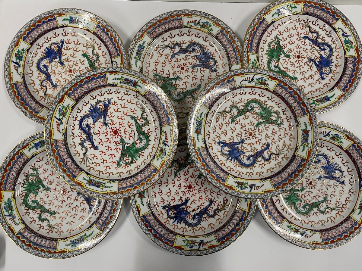 Vintage set of 8 Chinese Double Dragon porcelain plates. Excellent condition. 8" diameter. # 977