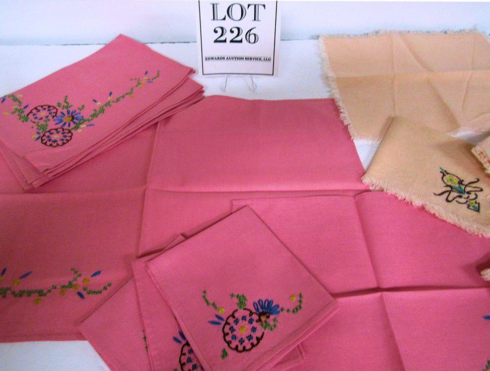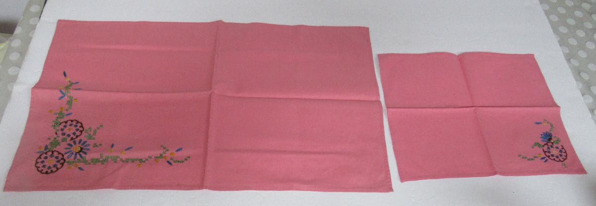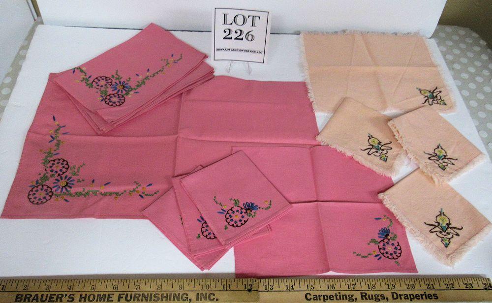 The dark pink set is very nice. The light pink set has one napkin with staining as seen in photo. Shipping is available at shipping cost plus $5.00 handling fee on up to 8 lots, $10.00 handling fee on 9 or more lots or two boxes. You will receive exact item as pictured, no refunds, returns not accepted.