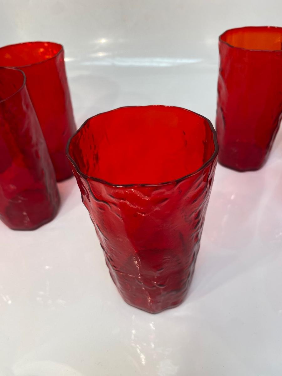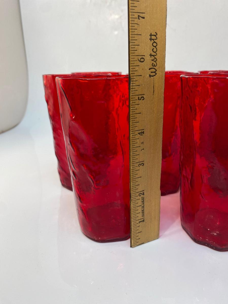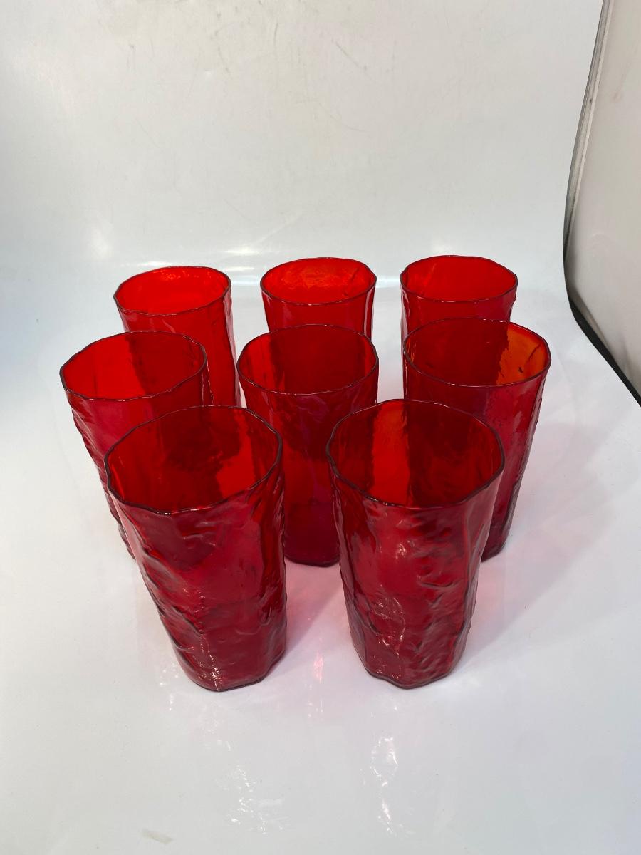 Set of 8 Vintage Ruby Red Amberina Morgantown Crinkle Glass Drink Glasses. In good vintage condition. No chipped edges. Vibrant red color. 5.5" size.