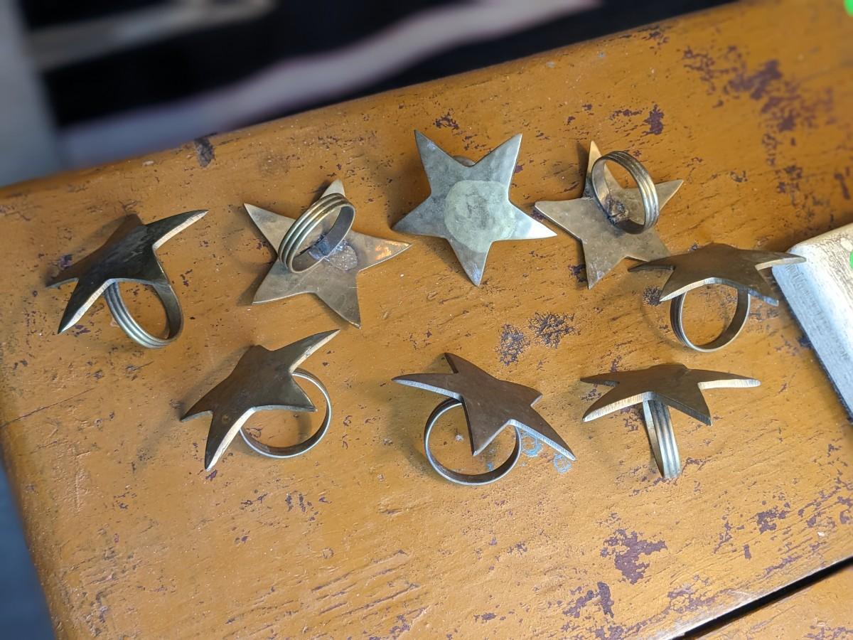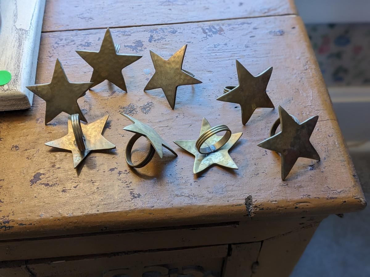 Set of 8 Vintage Solid Brass Star Napkin Ring Holders Hammered
