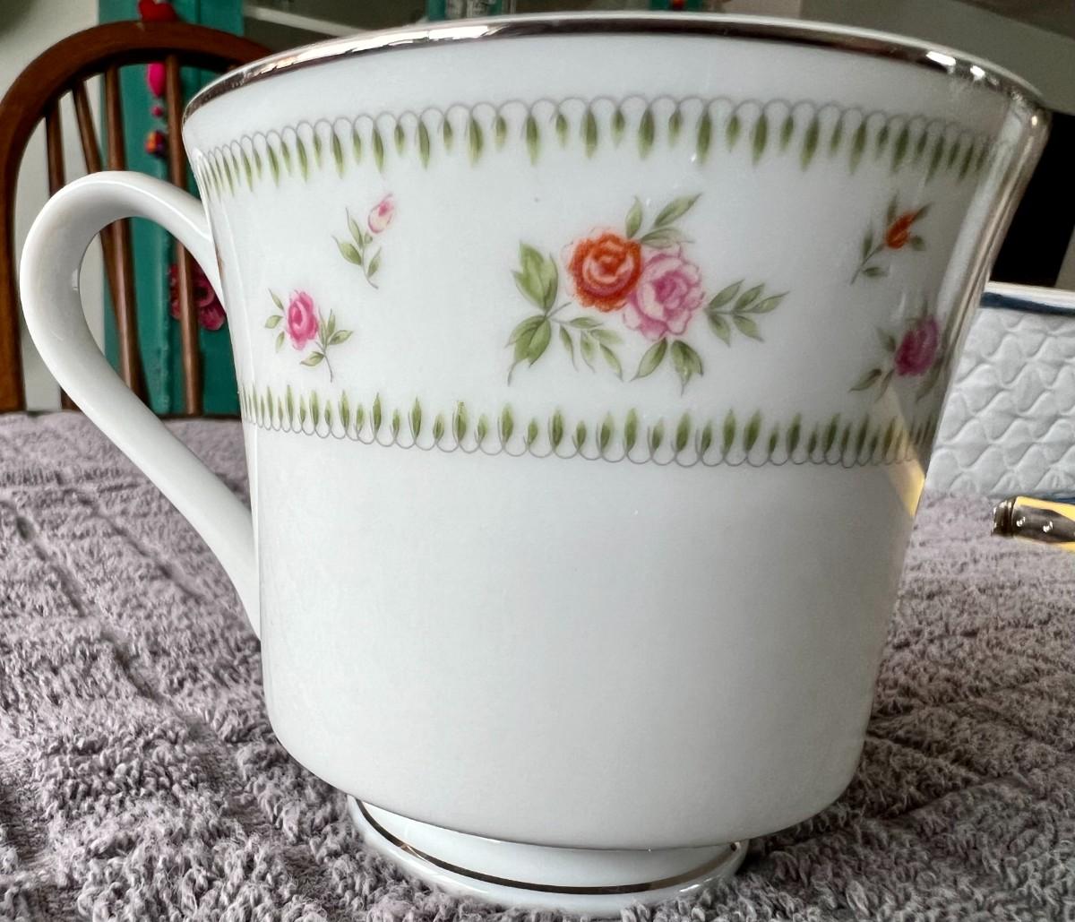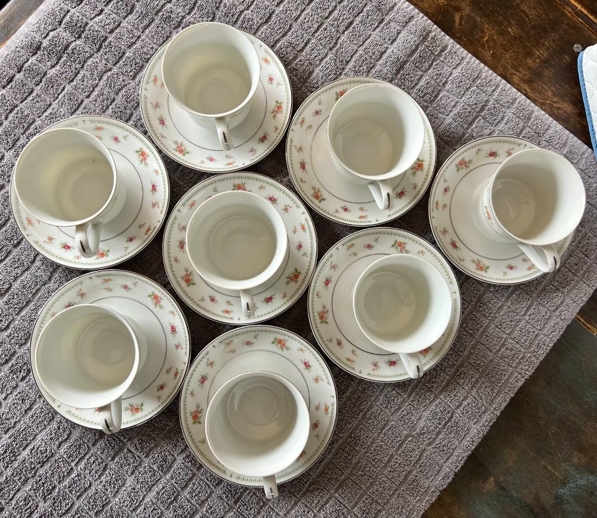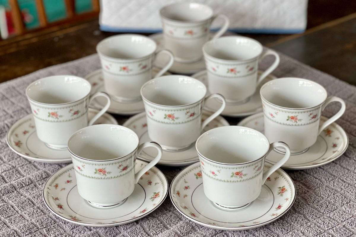 Set of 8 Vintage Tea Cups with Matching Saucers Floral Print Fine Porcelain China by Abingdon Japan