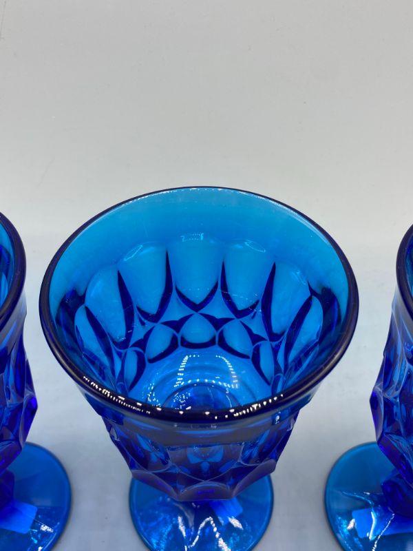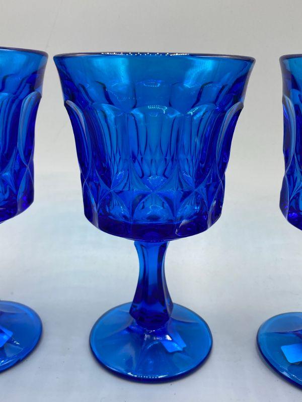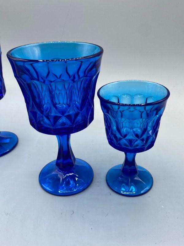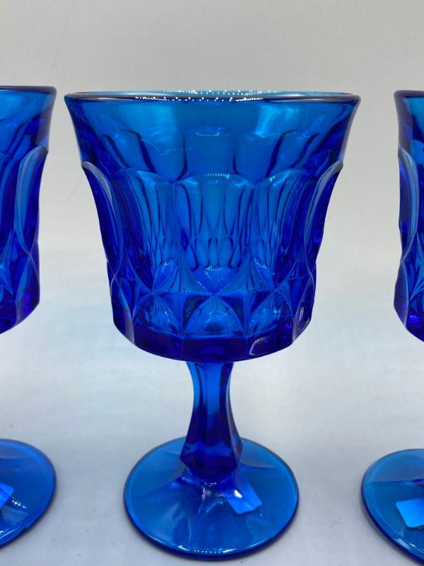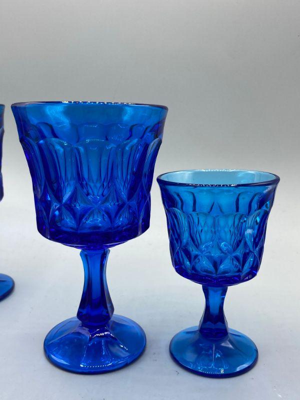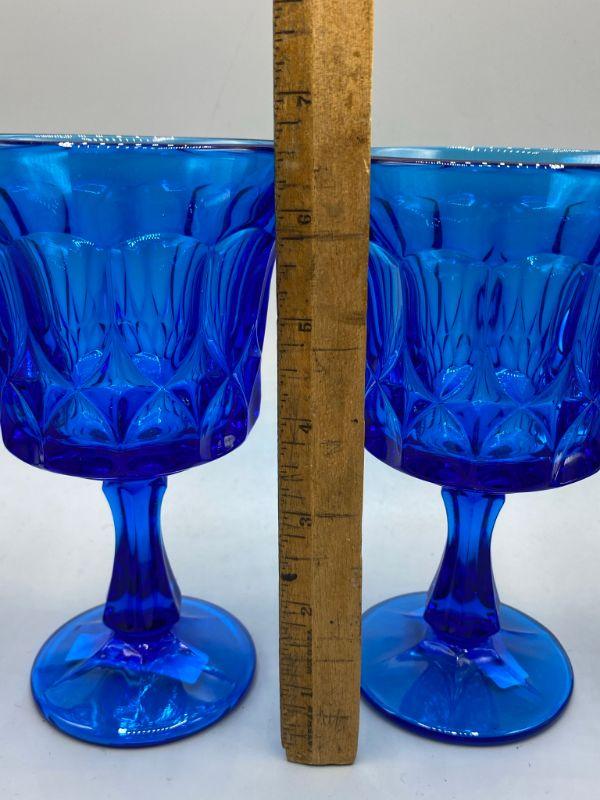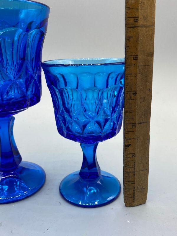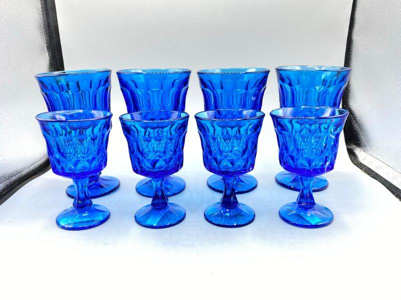 Vintage Noritake "Perspective" goblets. Set of 8, 4 large and 4 small. Brilliant true blue color. These glasses have a thumbprint honeycomb kind of design to them. Stunning cut and color. The large goblets are about 6.5" while the smaller are 5" size. Excellent vintage condition.