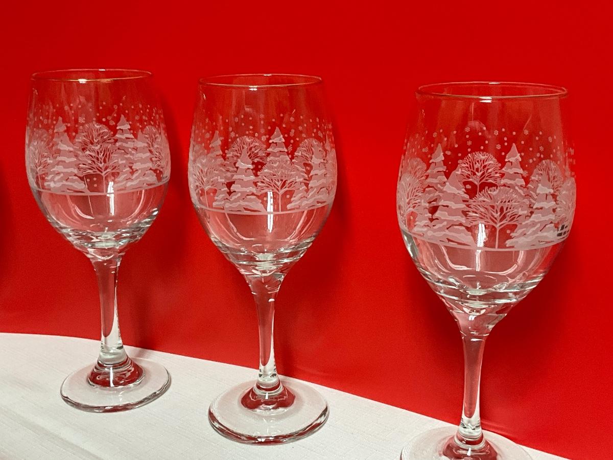 Set of 8 wineglasses with snowy trees etching and gold rim