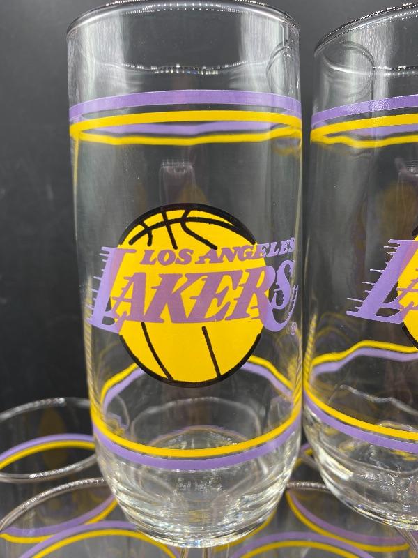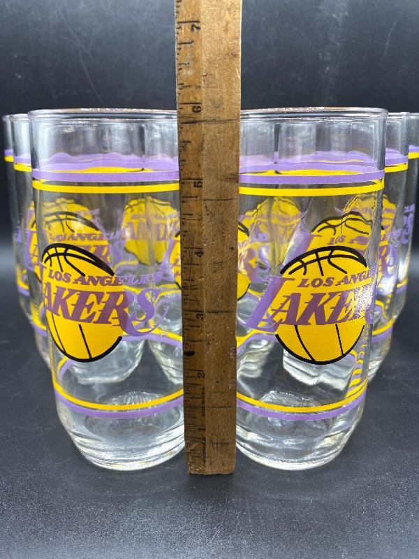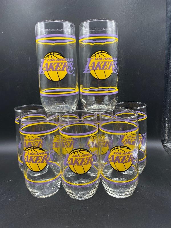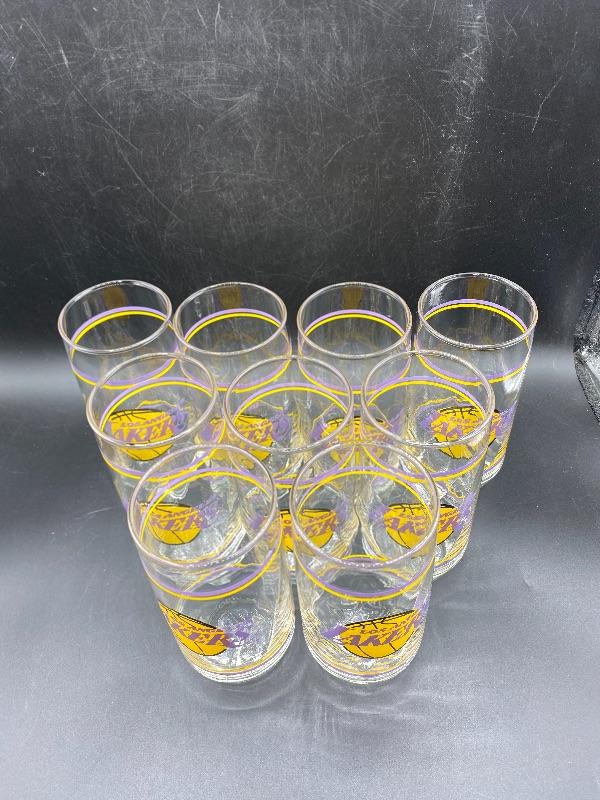 Set of 9 Los Angeles Lakers drink glasses. About 5.5" size. Clear glass with logo, basketball, and purple & gold stripes. Excellent condition.