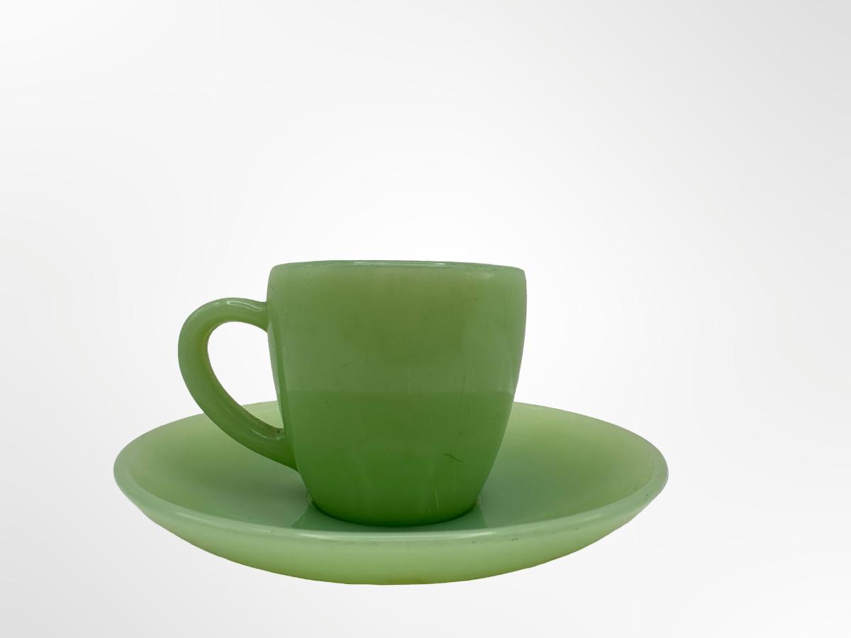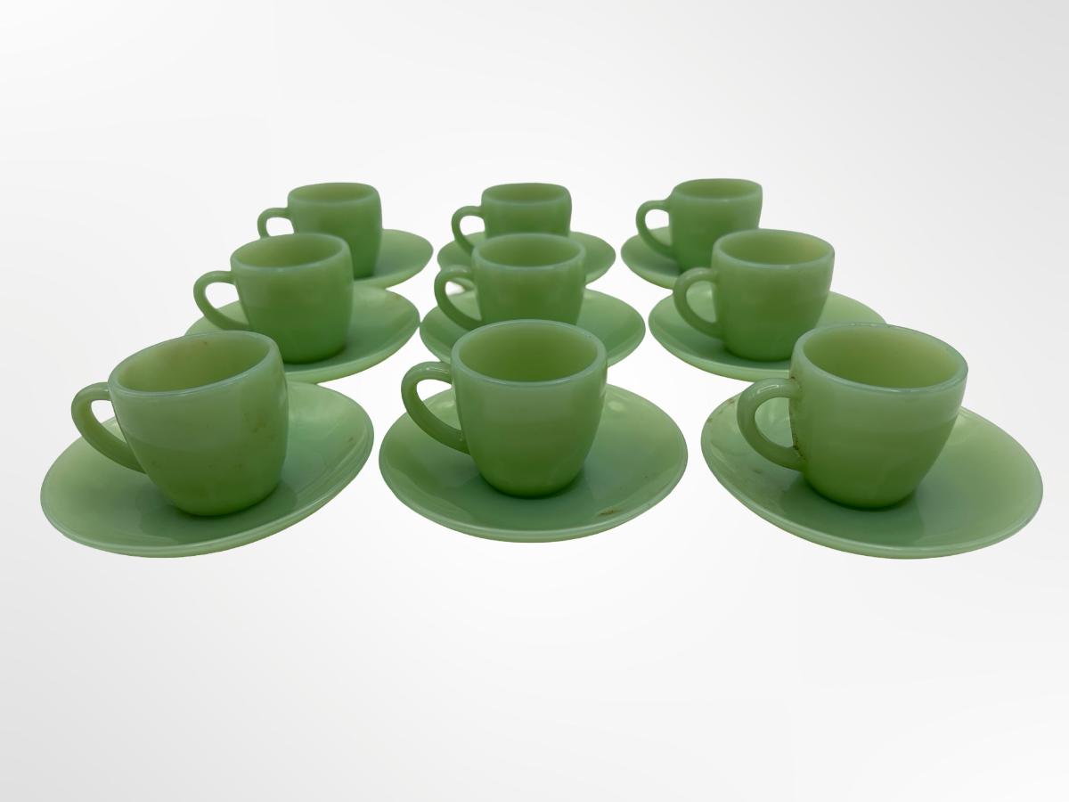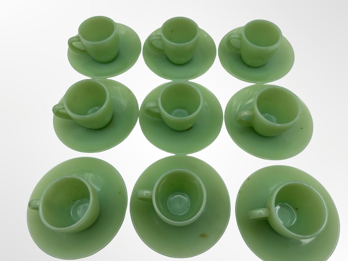 Set of 9 Jadeite Green Glass Demitasse Cups with Saucers