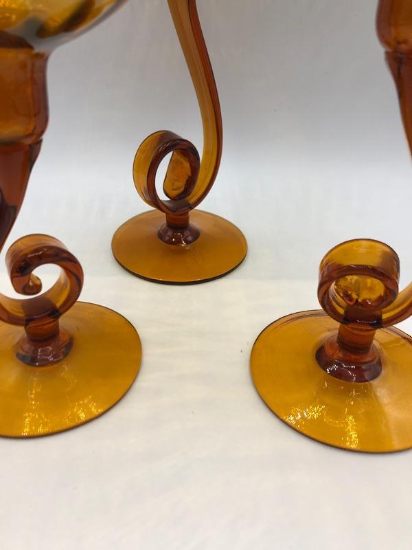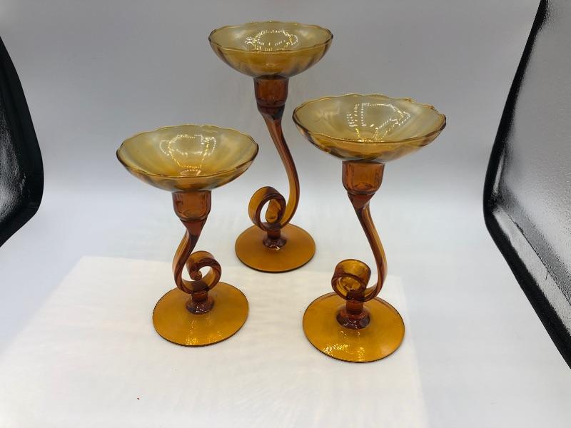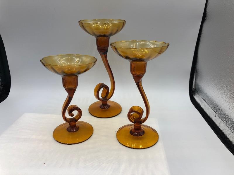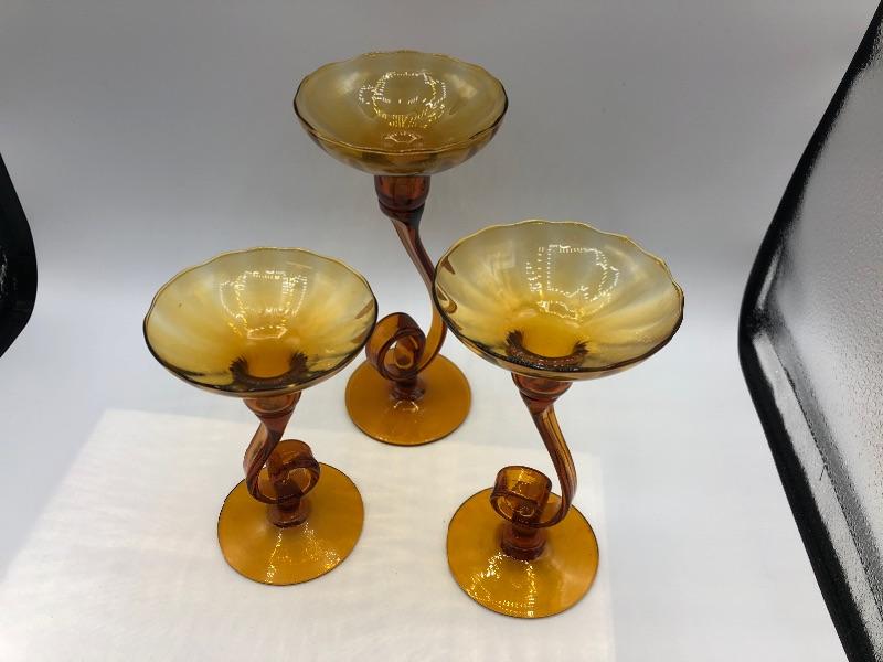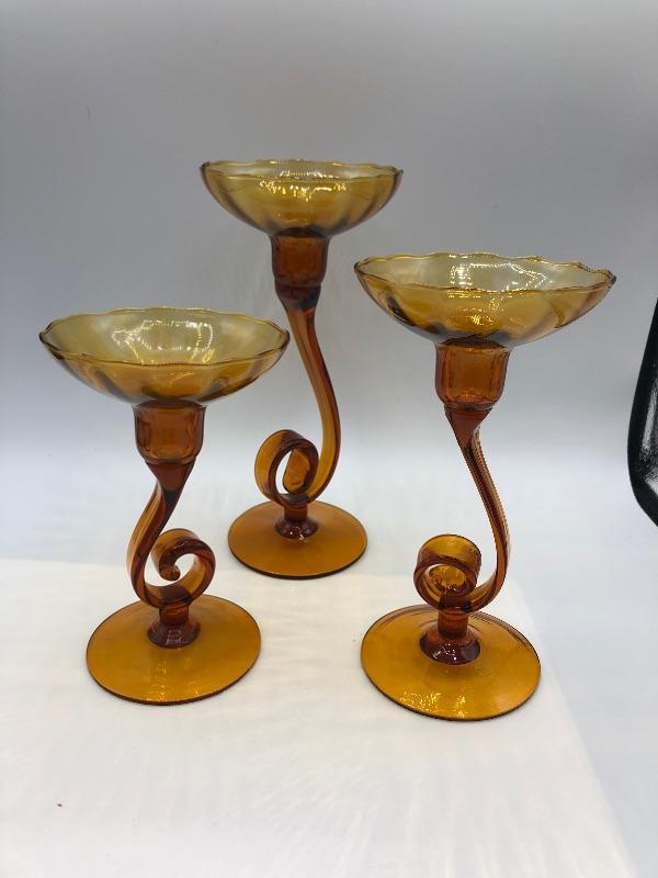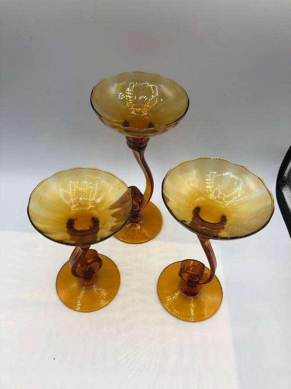 Set of 3 swirled glass candle holders. Amber gold colored glass. Hold taper candles. Different heights. Good Condition.