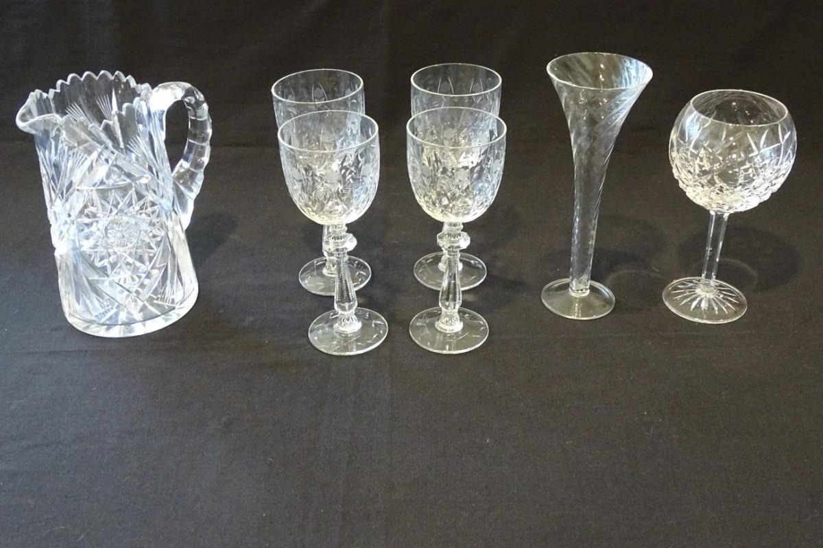 Assorted Vintage Hand Cut Lead Crystal Glasses and Water Pitcher, Waterford