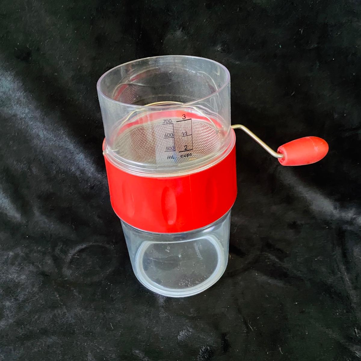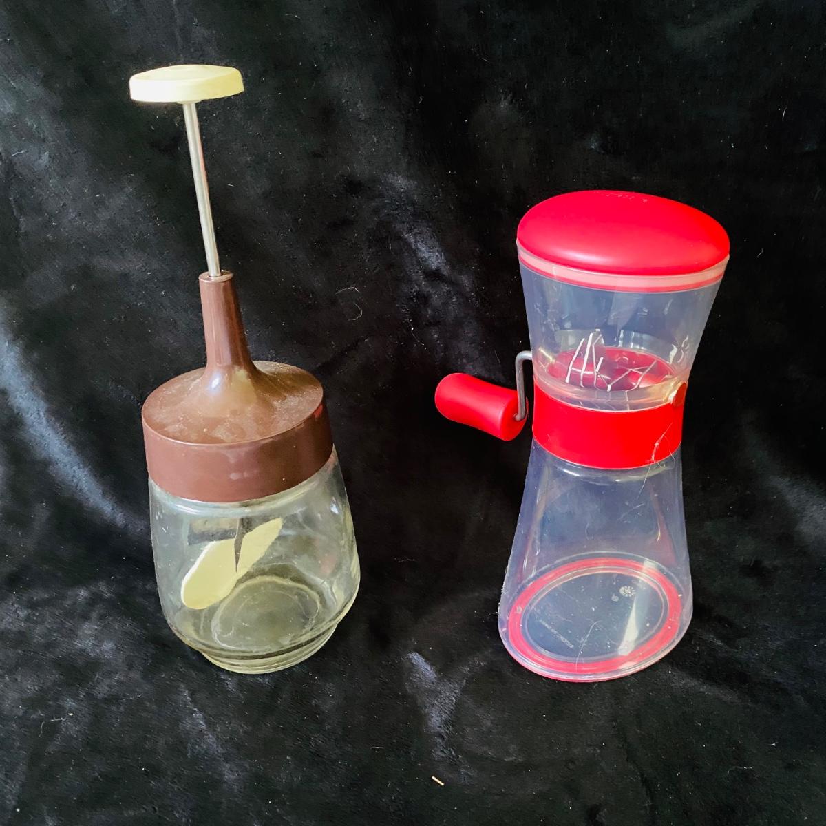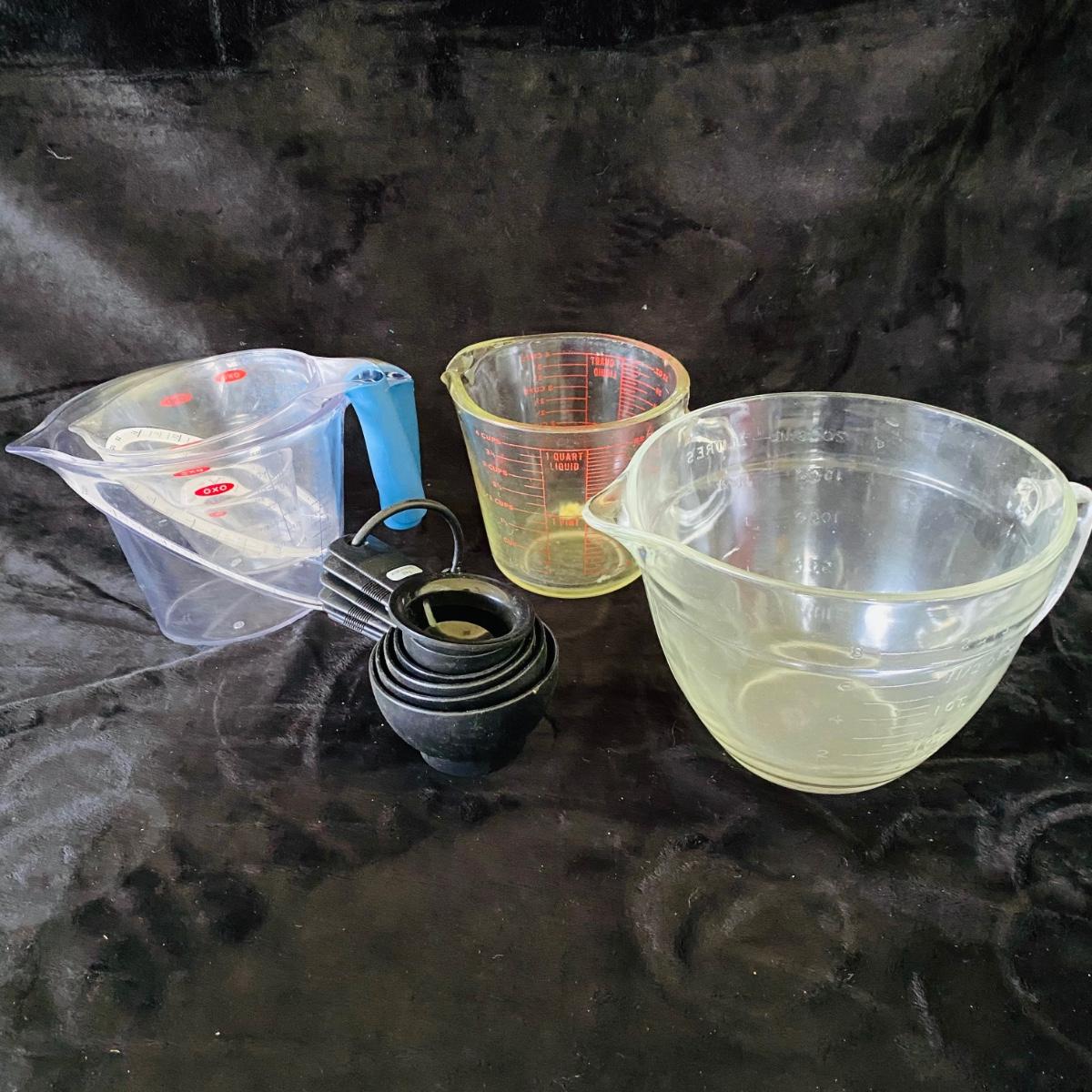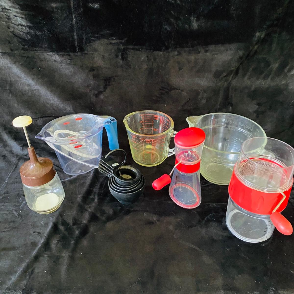 Set of baking items. Two large glass measuring cups, three plastic measuring cups, small set of plastic measuring cups. Two nut choppers. One Progressive flour sifter. Two aprons. Good condition.