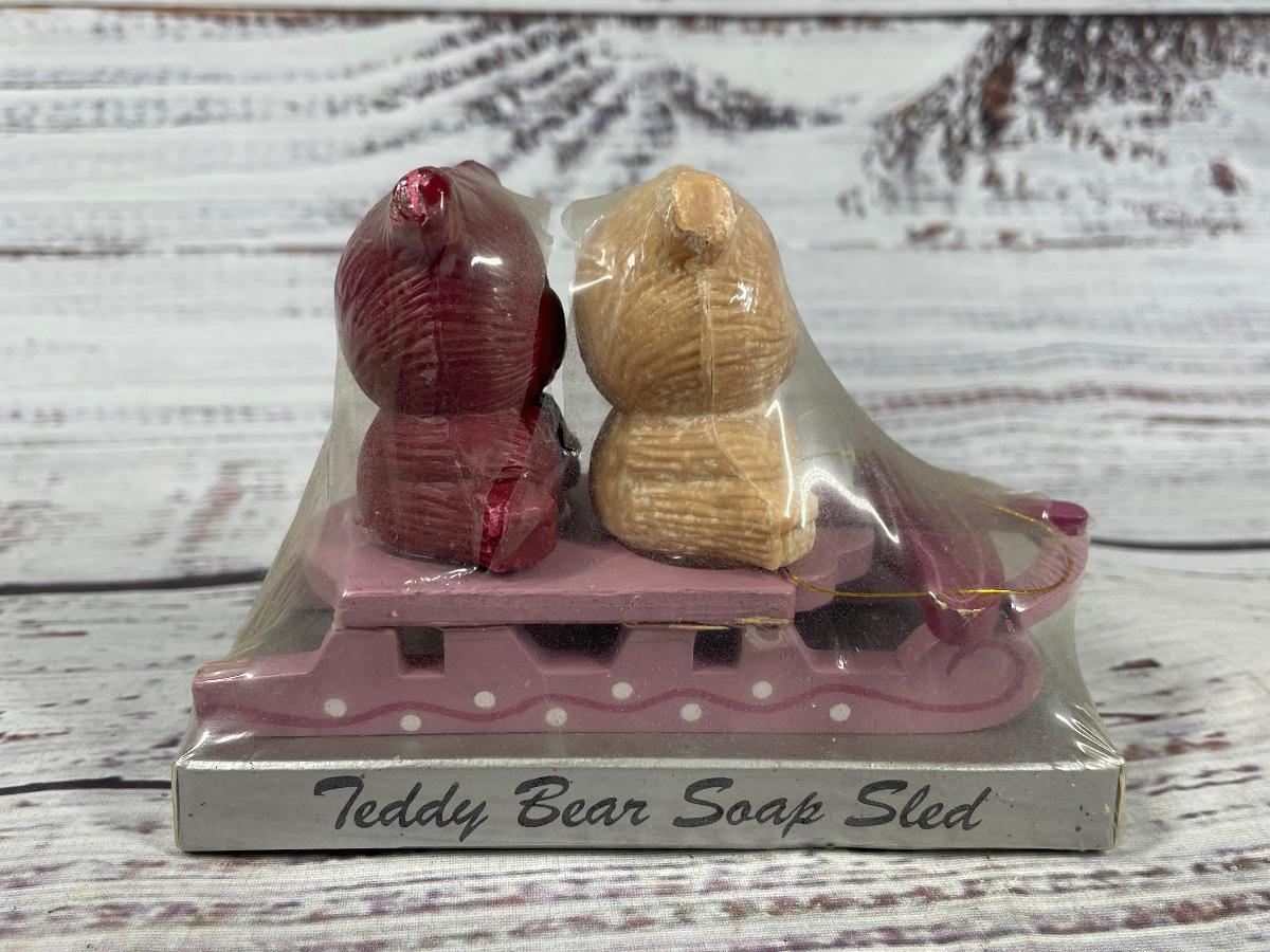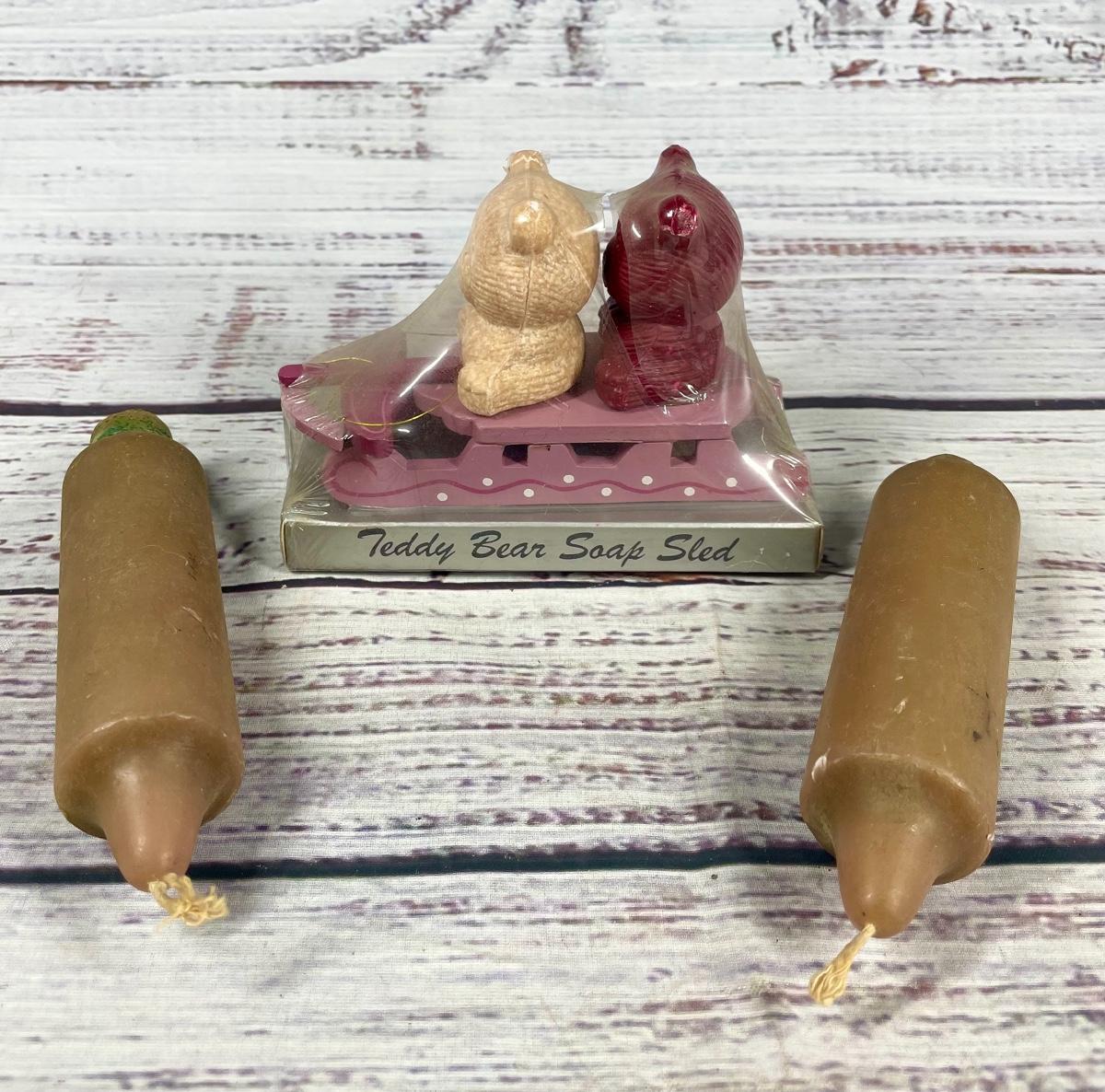 This item comes with a teddy bear soap sled and two candles. Both items are in decent condition. The packaging for the bear soaps are a little open but not used.