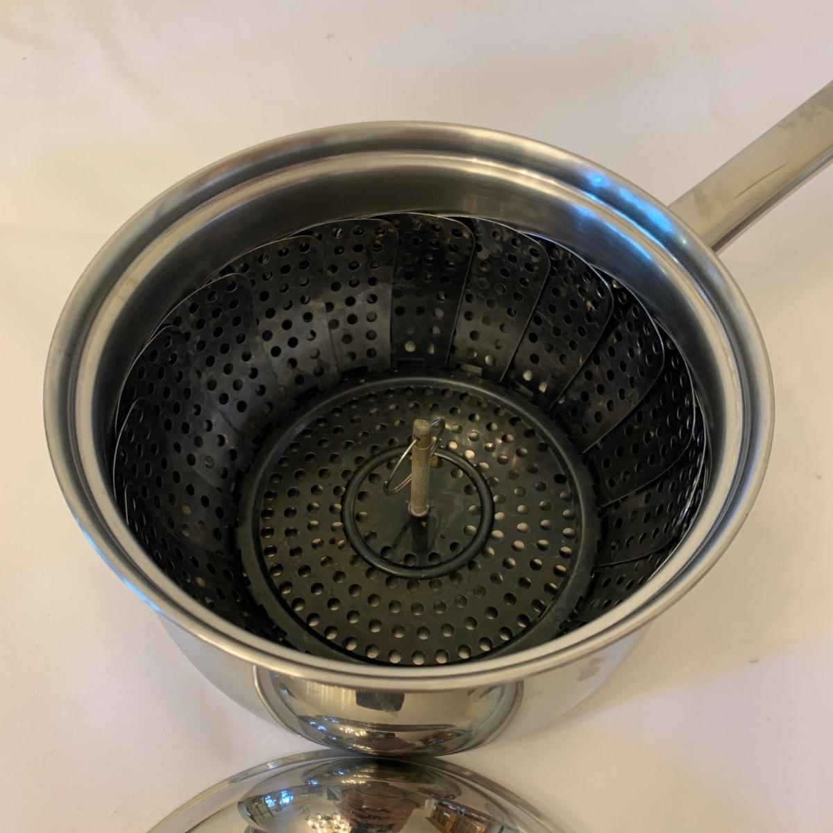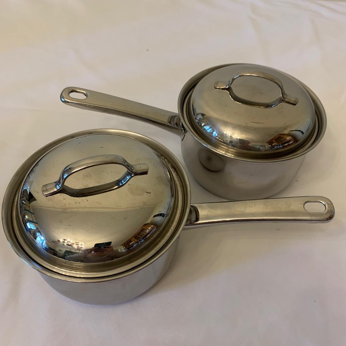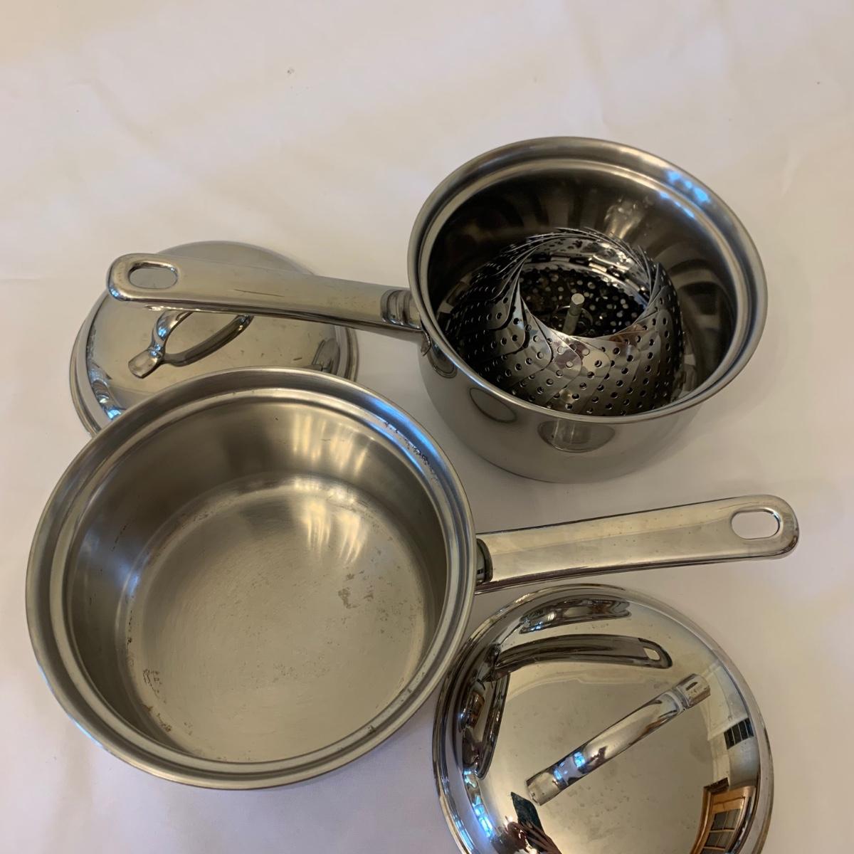 Set of four Belgique brand metal pots with lids. Includes an 8 quart pot with a steamer basket, a 2 quart saucepan, and two 1 quart saucepans. Two extra steamer baskets are also included, not likely part of the original set. All items are in very good condition, with some signs of use, shown in the pictures.
