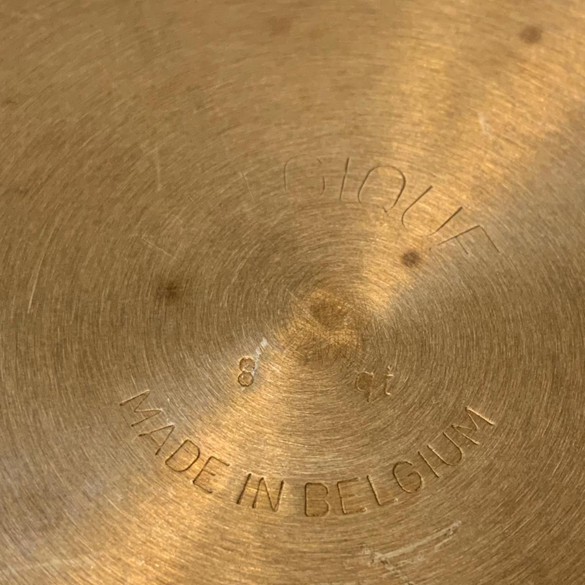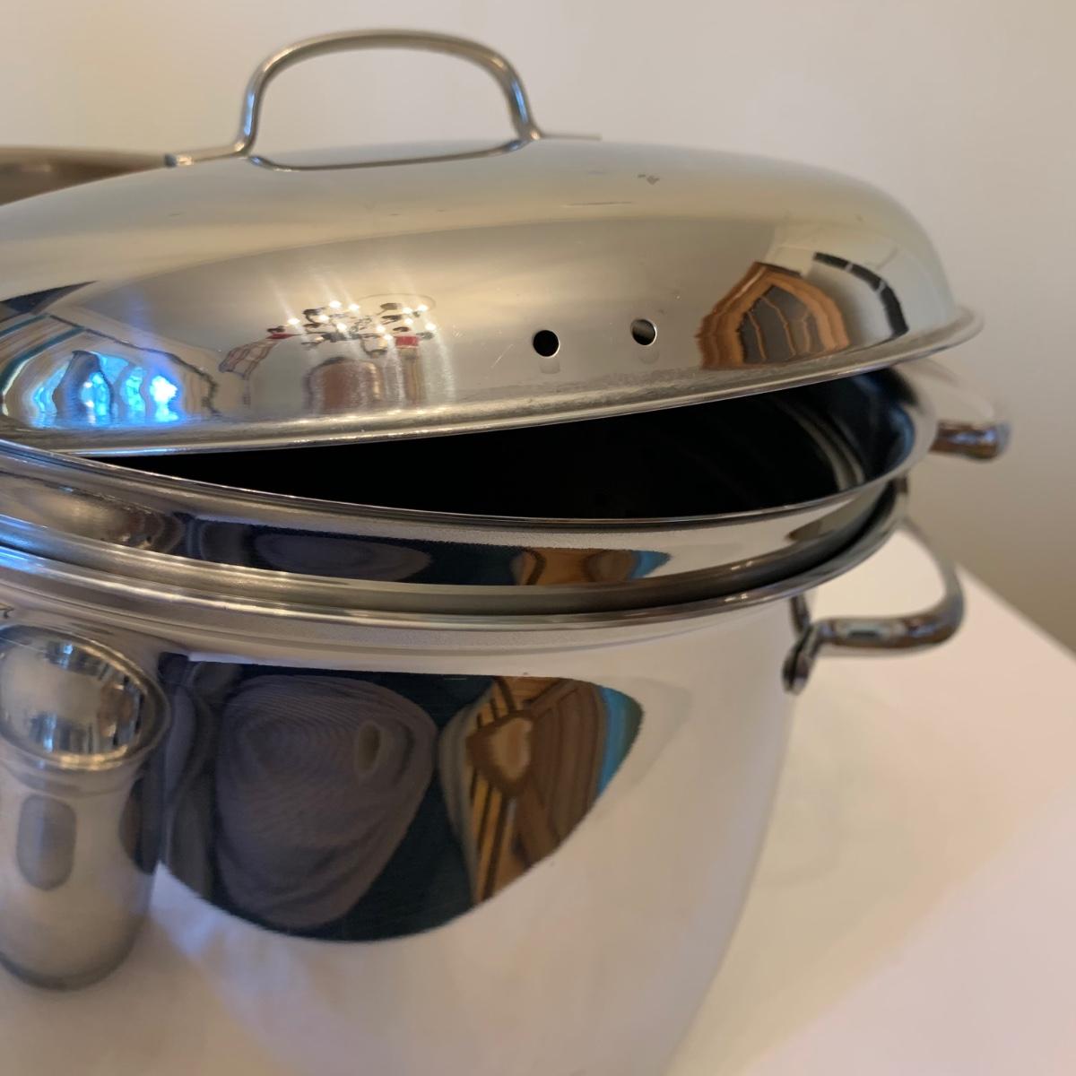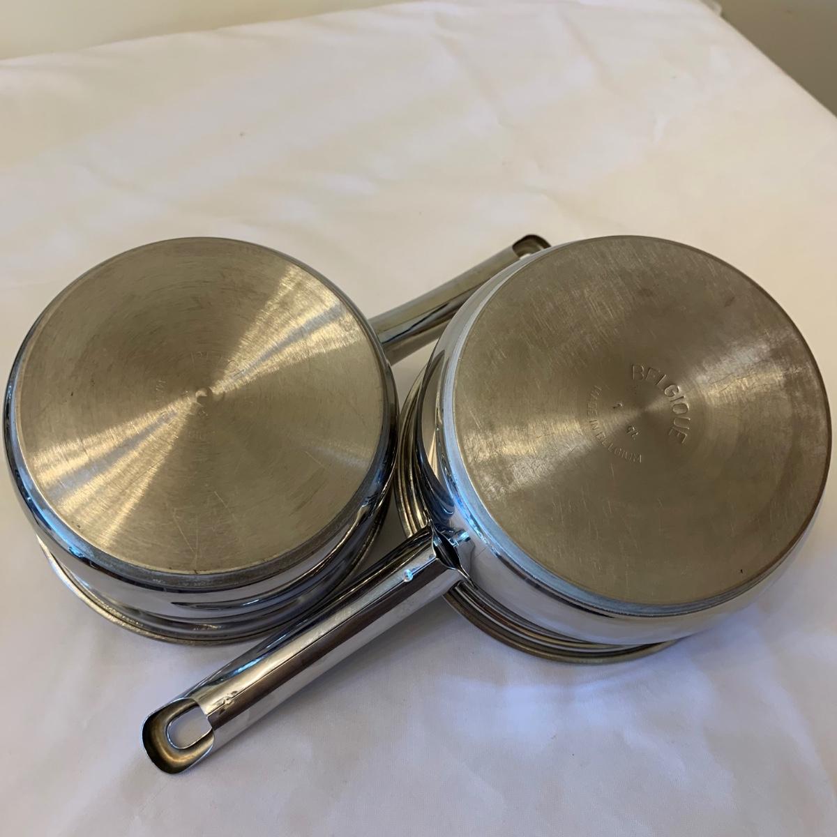 Set of four Belgique brand metal pots with lids. Includes an 8 quart pot with a steamer basket, a 2 quart saucepan, and two 1 quart saucepans. Two extra steamer baskets are also included, not likely part of the original set. All items are in very good condition, with some signs of use, shown in the pictures.