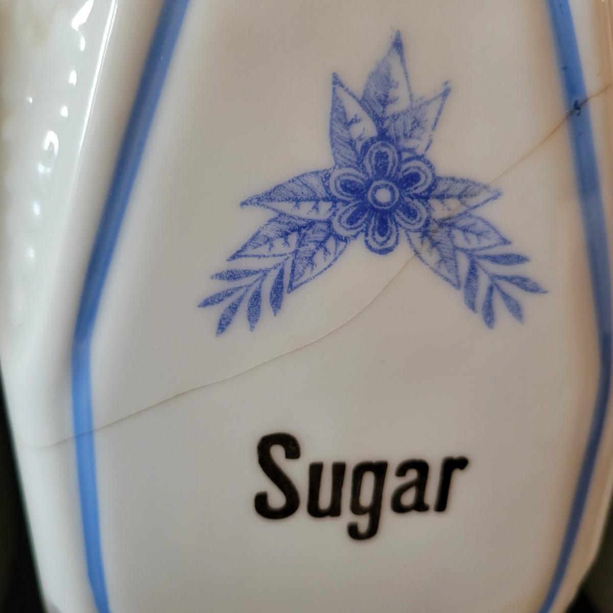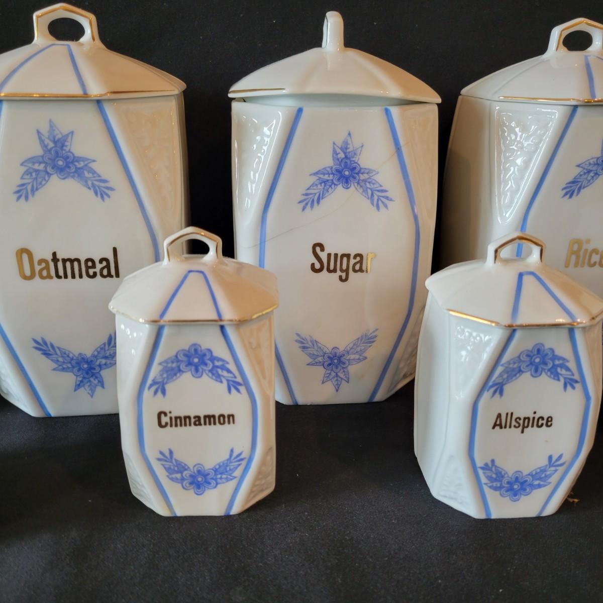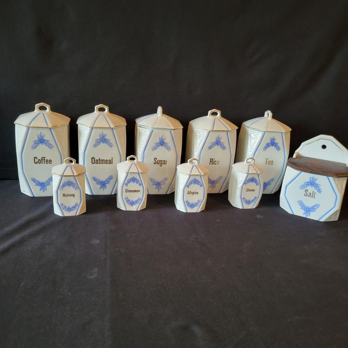 A set of 10 ceramic kitchen jars that are labeled for different kitchen items. The five larger containers measure approximately 4" x 4" x 8.5"H. The sugar container has a notable crack that has been repaired. Please note that a lid to one of the larger containers was broken during preview. Shipping available