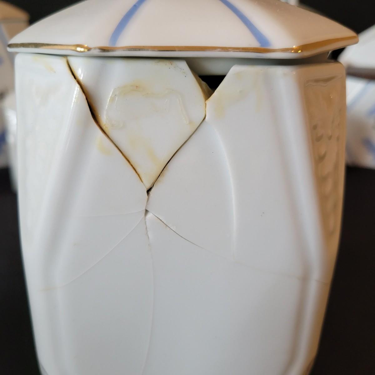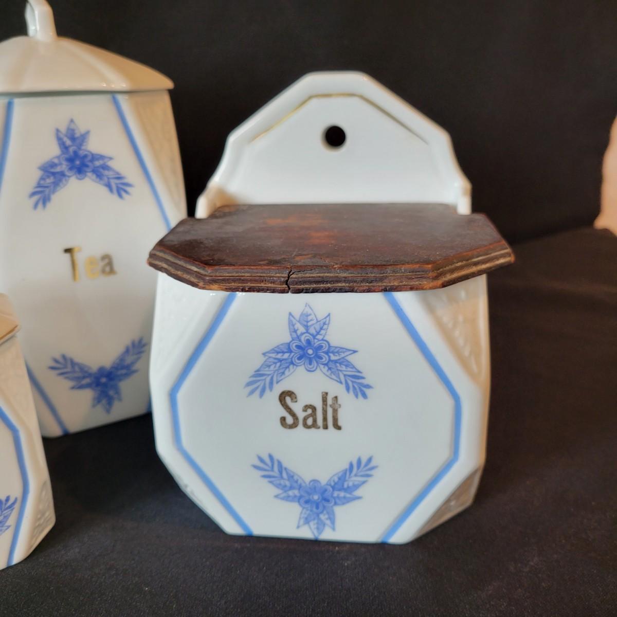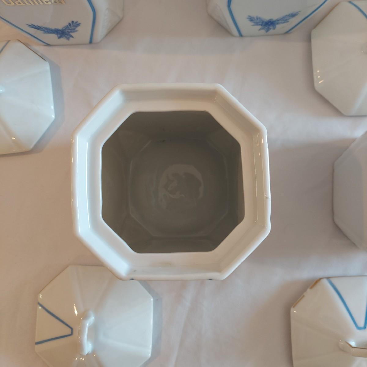 A set of 10 ceramic kitchen jars that are labeled for different kitchen items. The five larger containers measure approximately 4" x 4" x 8.5"H. The sugar container has a notable crack that has been repaired. Please note that a lid to one of the larger containers was broken during preview. Shipping available