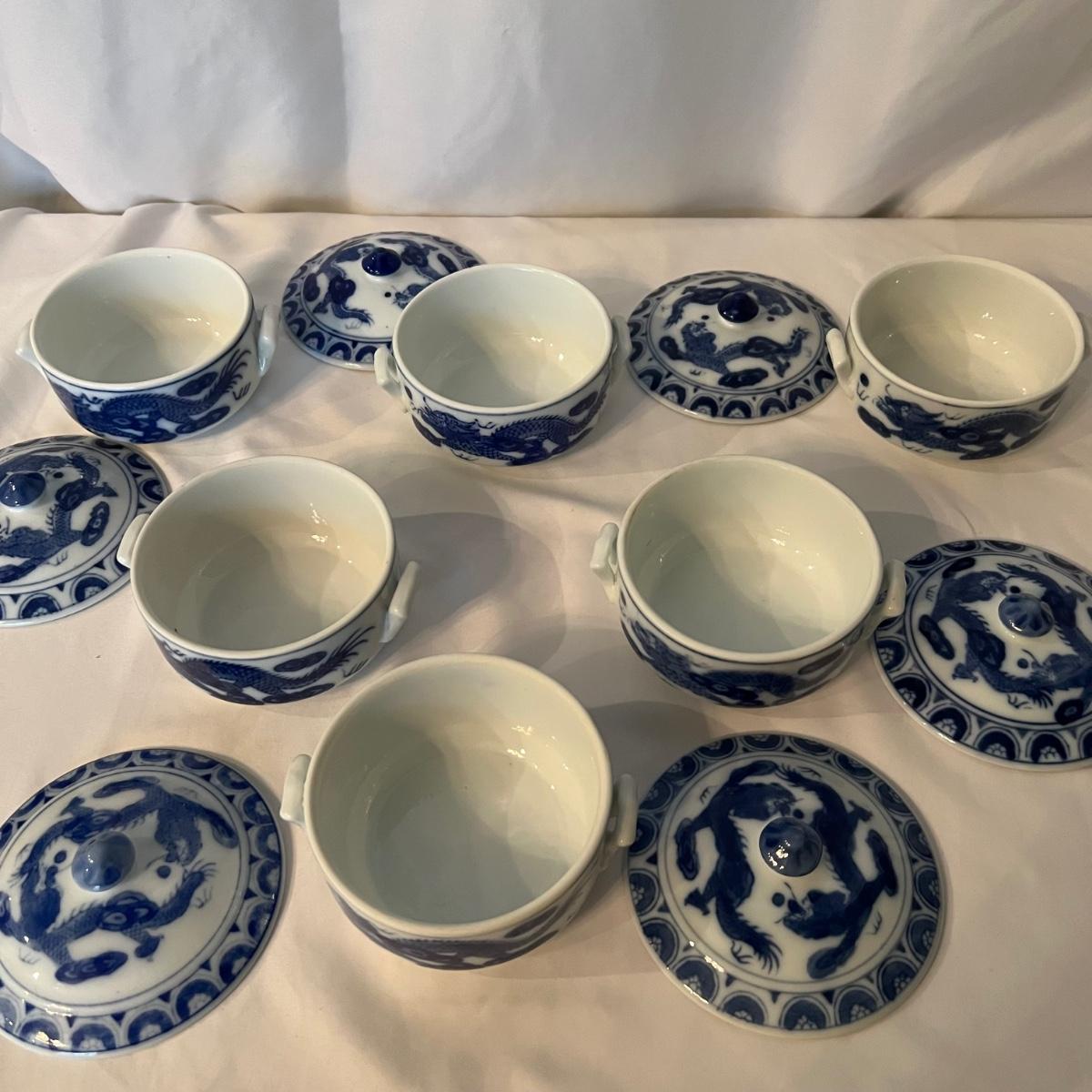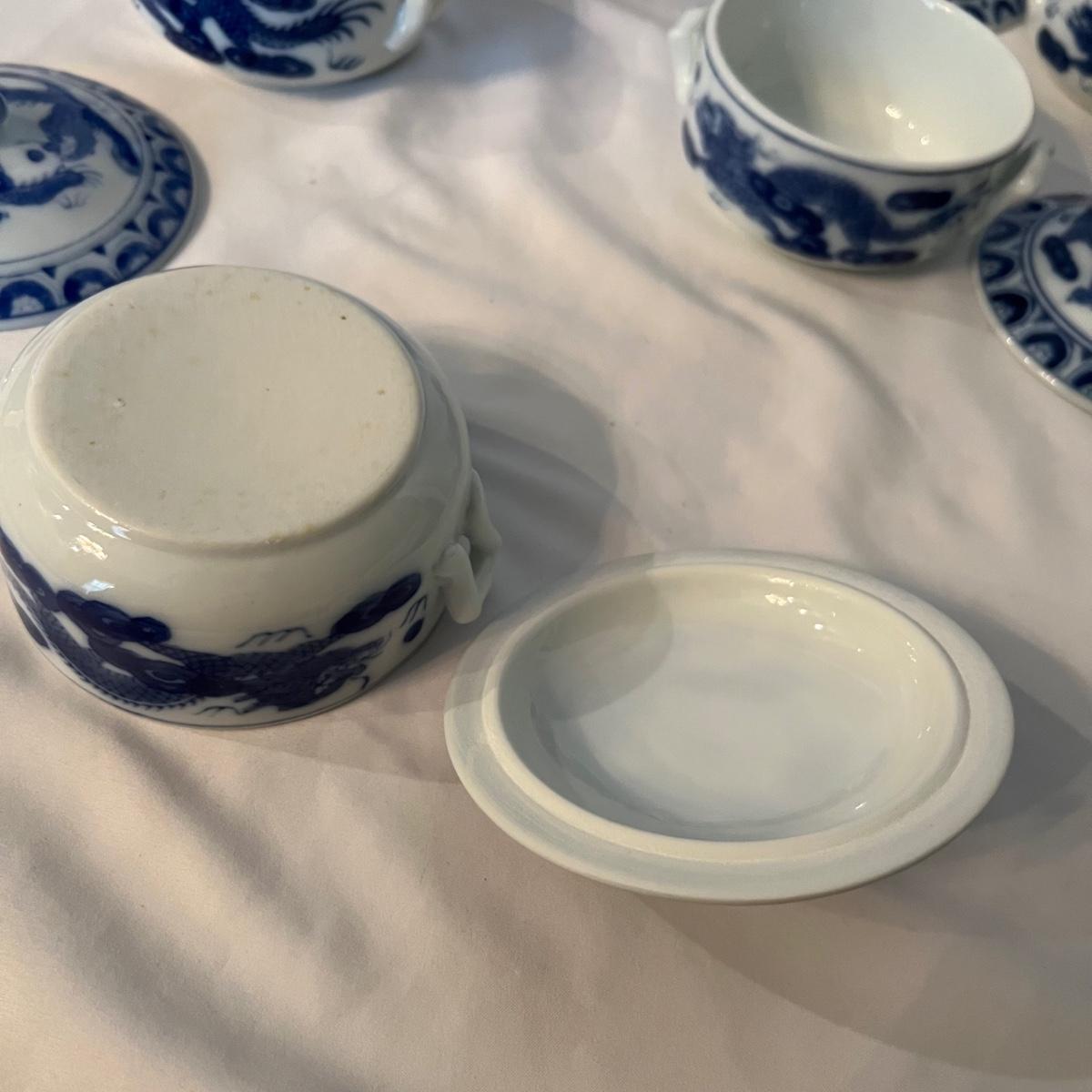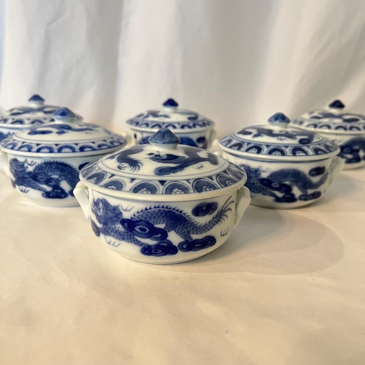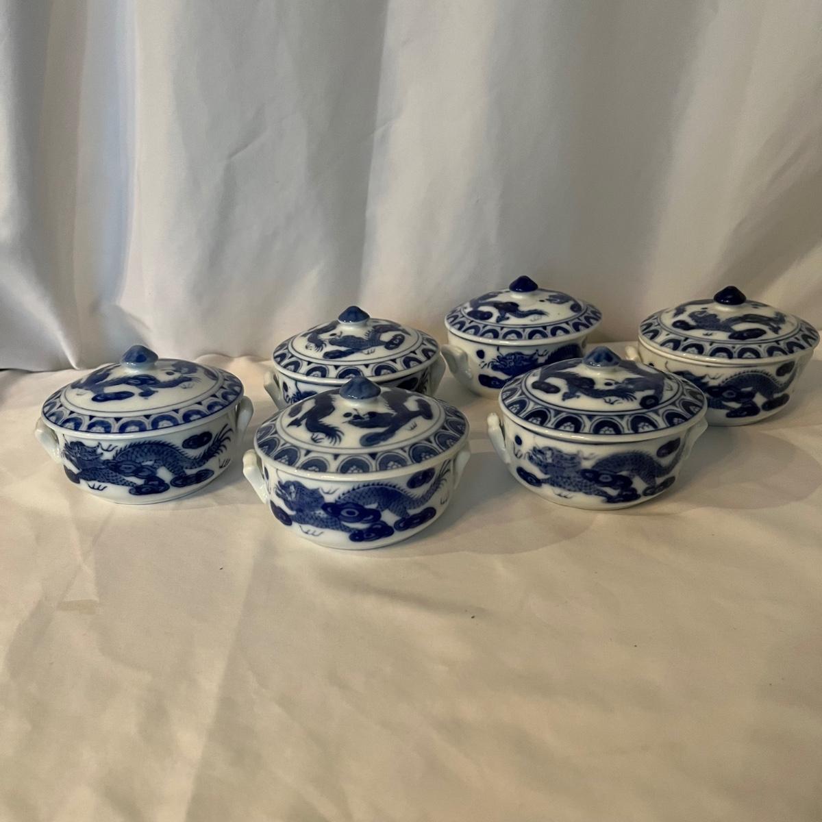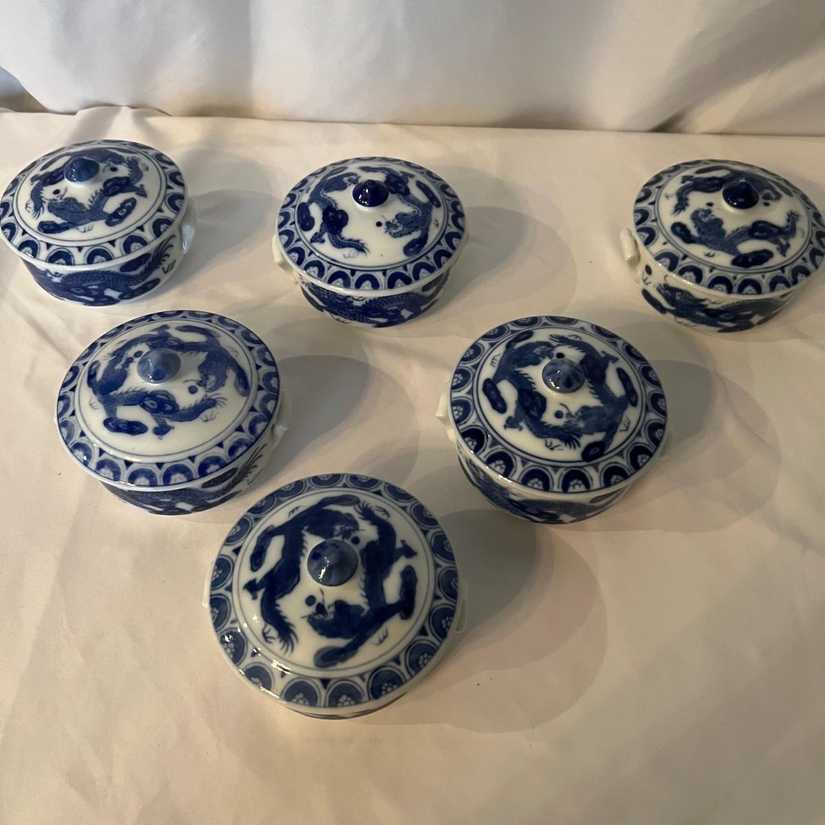 A set of six dishes with lids that are ceramic with a blue and white Chinese dragon design. Note that that a couple of lid tops are a slightly darker blue than the rest.