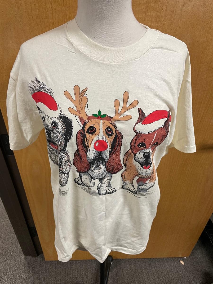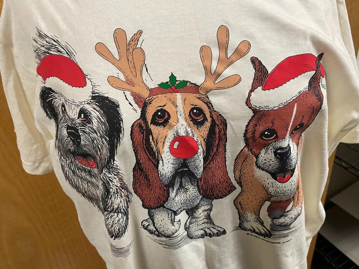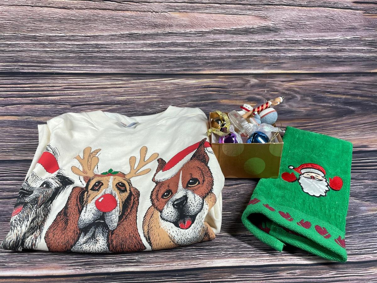 This set includes: one adult medium dog with Christmas hats shirt, a Santa towel, and five ornaments/decorations. All items are in good condition. The ornament with the North Pole sign is missing a ribbon for it to hang on the tree.