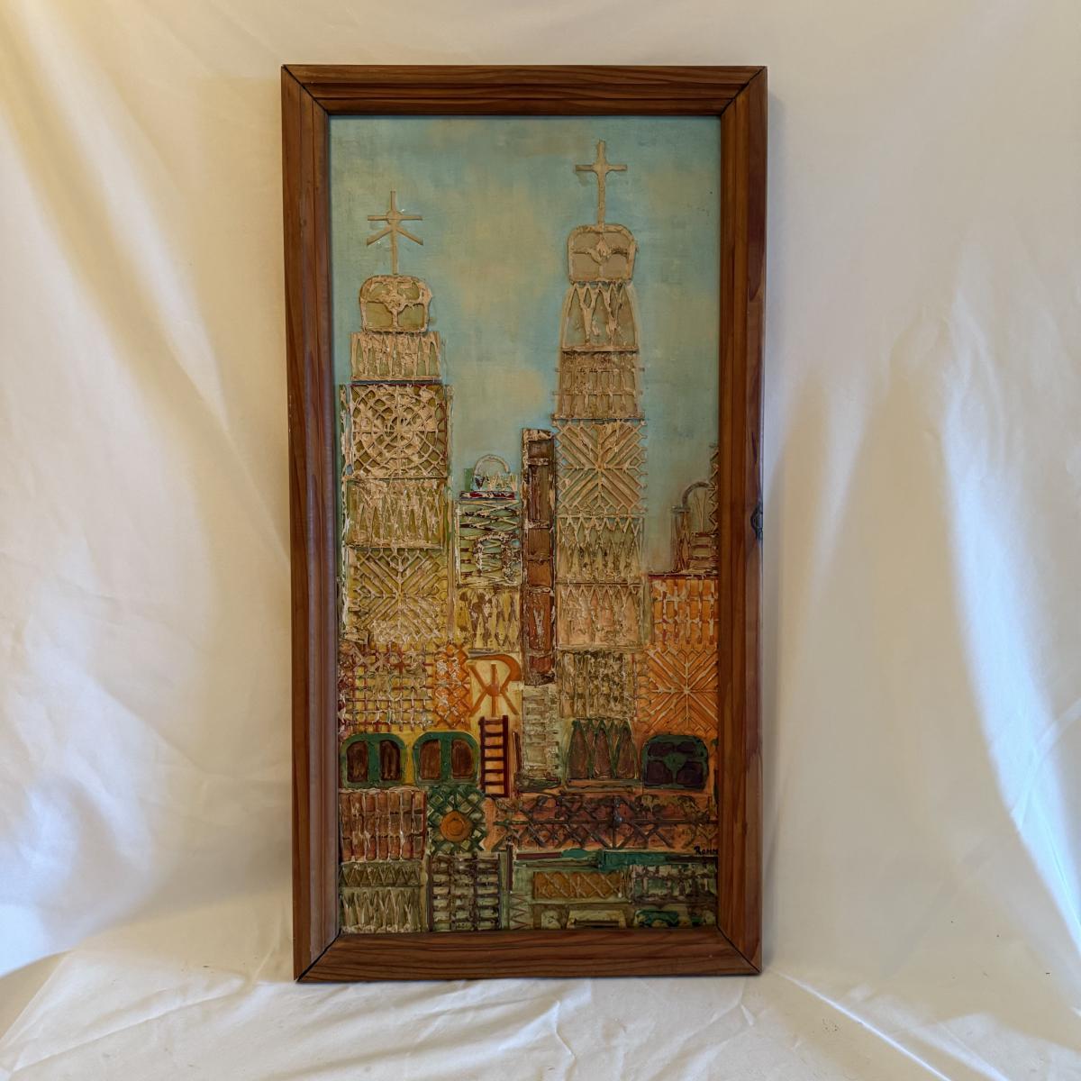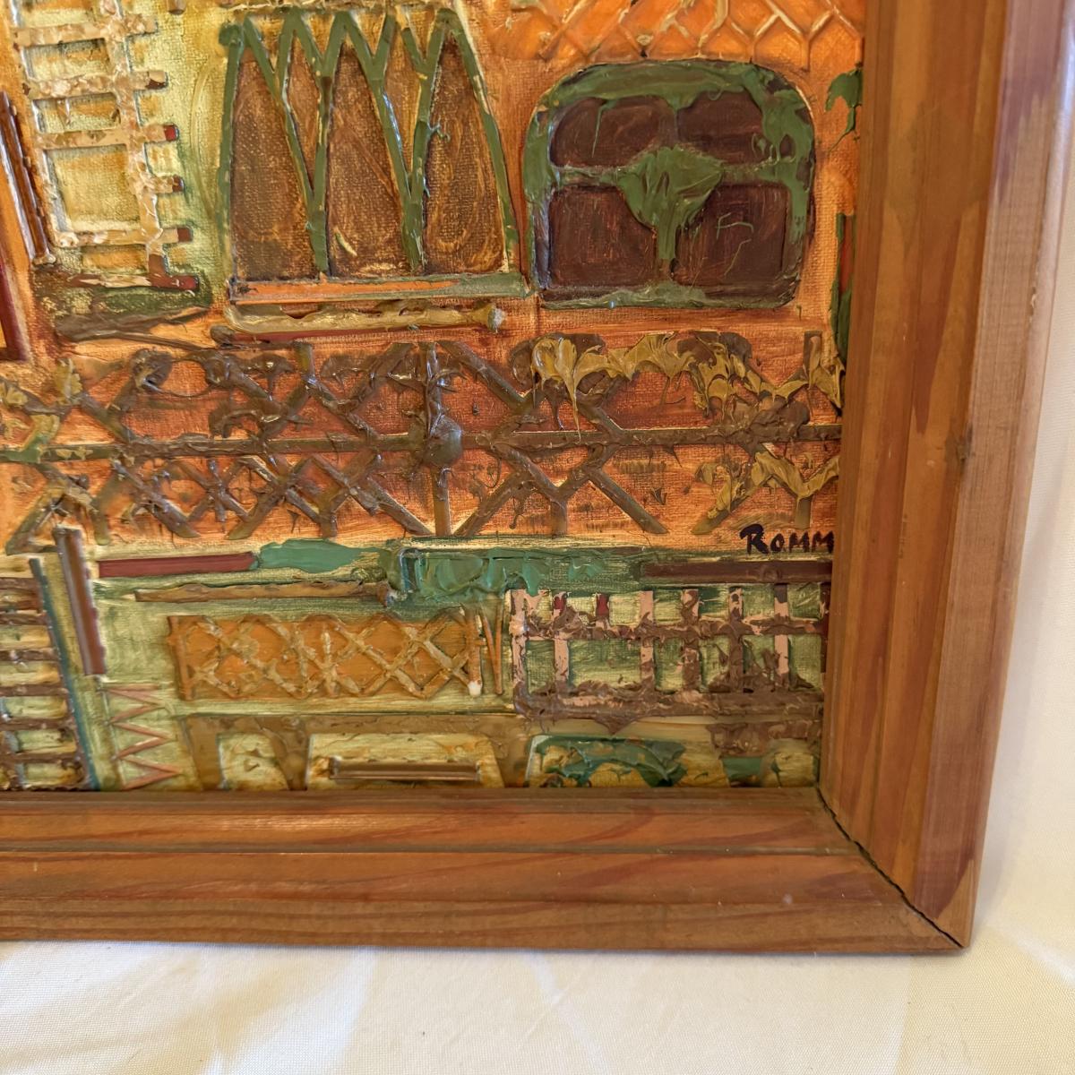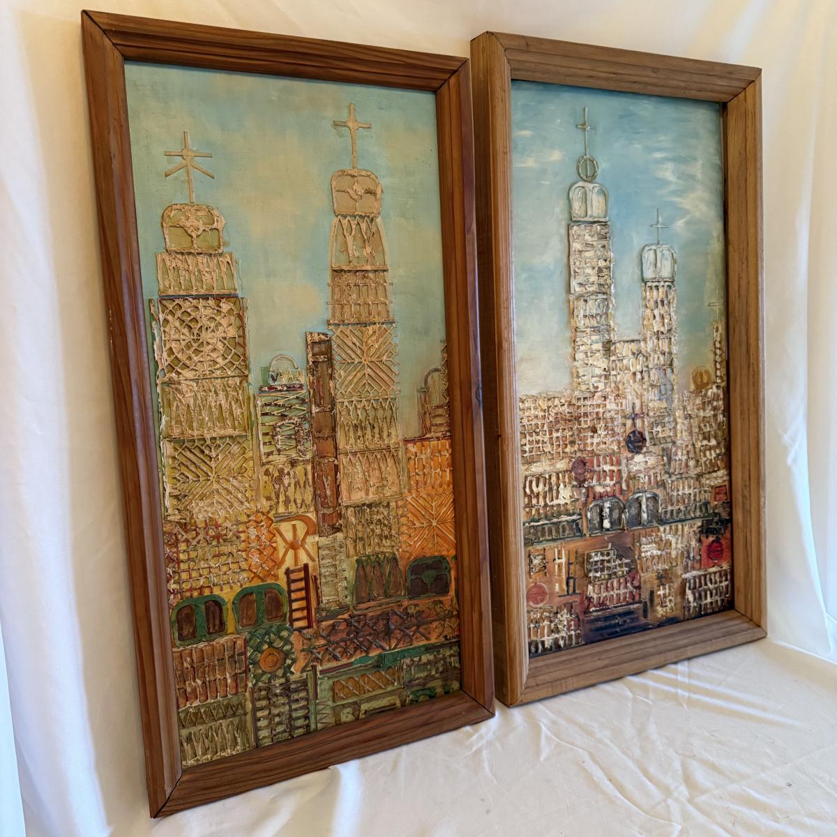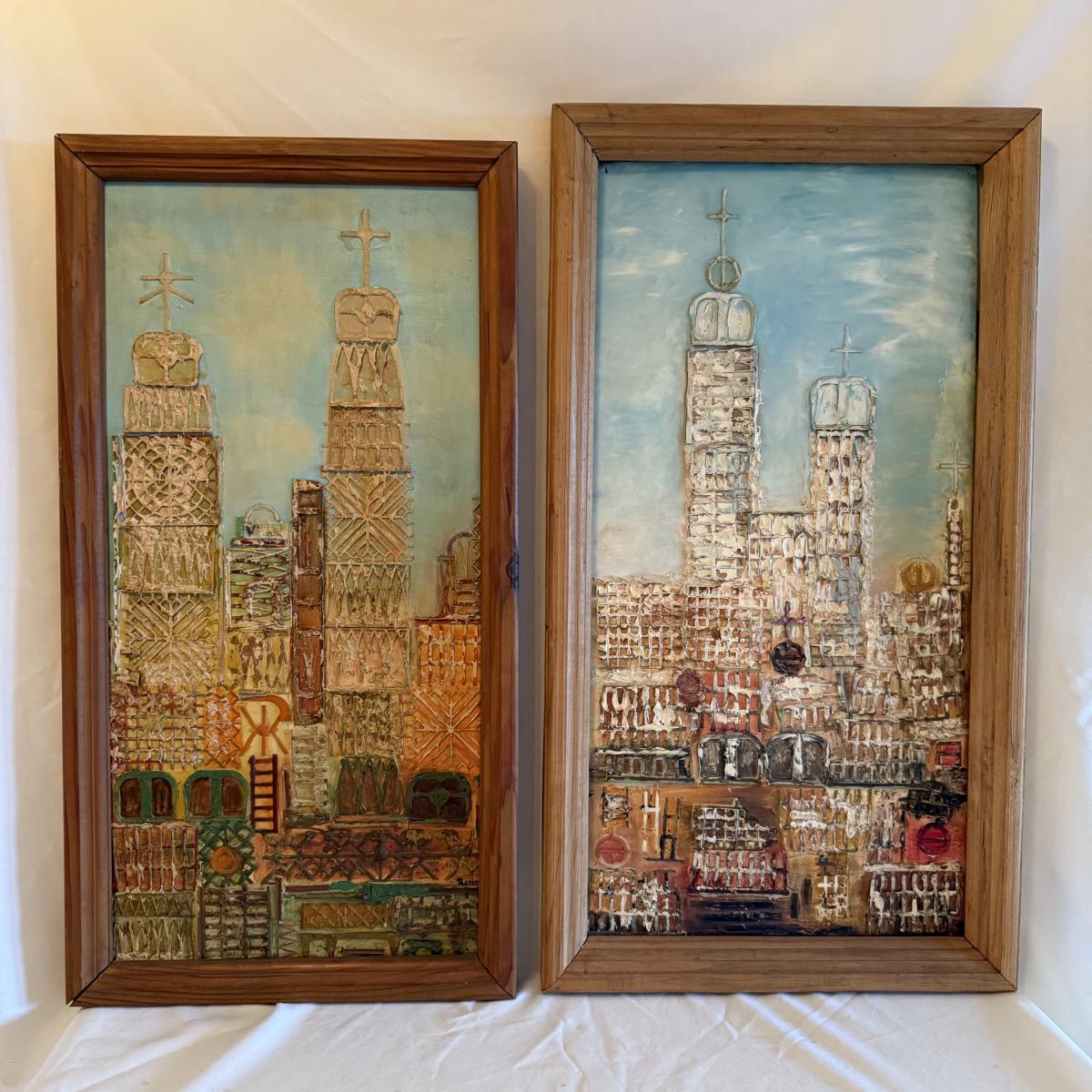 This lot contains two similar style cityscape multimedia paintings. The first measures 16” x 31”. This one is slightly smaller than the other and does have hardware to be hung. It is signed “Romm” in the bottom right corner. The other painting is slightly bigger, it measures 18” x 34”. This one is falling out of the frame a bit and reinforcing it would be recommended. This slightly larger one does not have a signature or hardware to be hung. Shipping available. Shipping can be costly. Please contact our local shipping provider Postage Express with dimensions for a shipping quote prior to bidding. 828-255-9250 or shipping@postageexpressnc.com