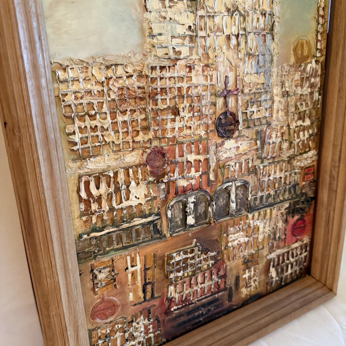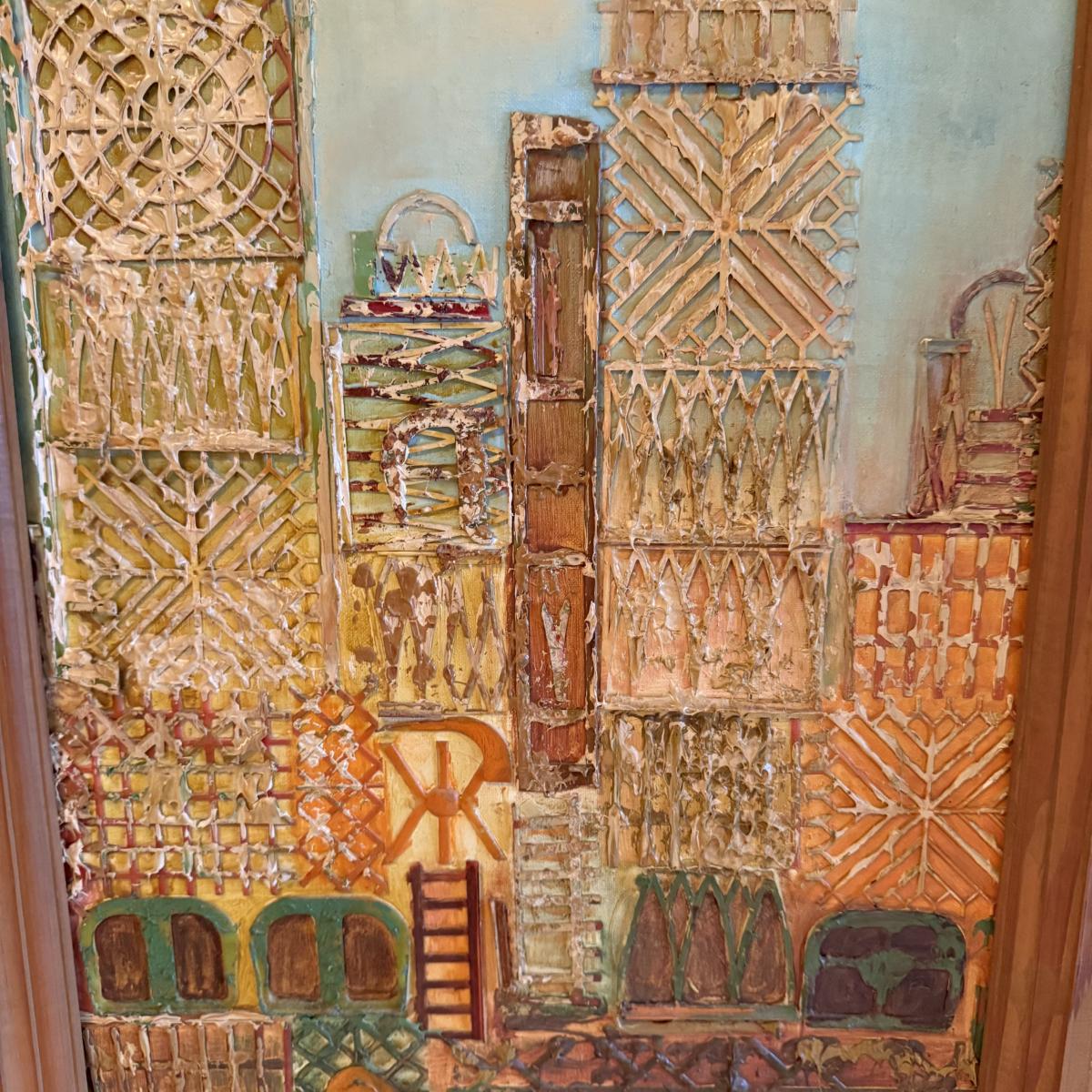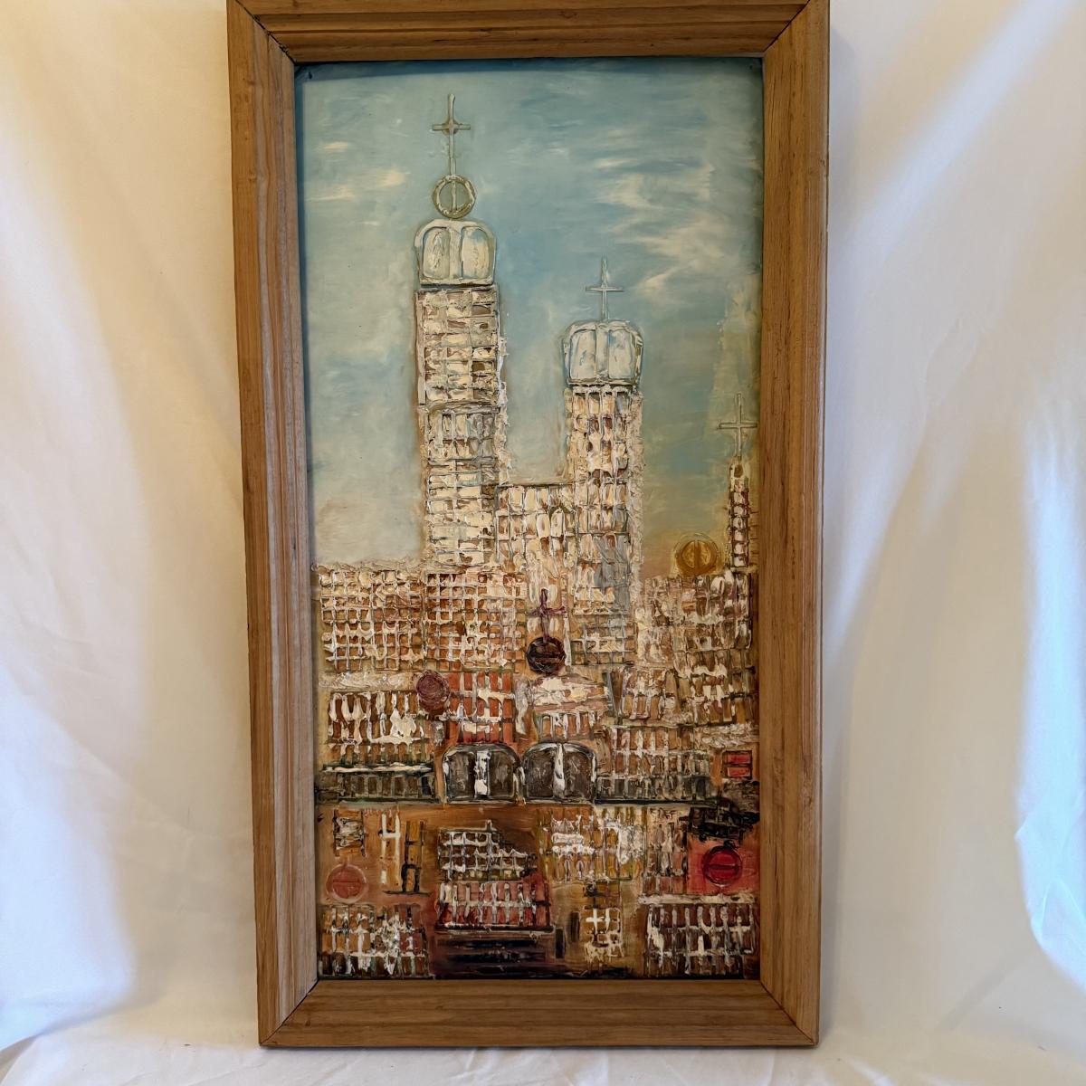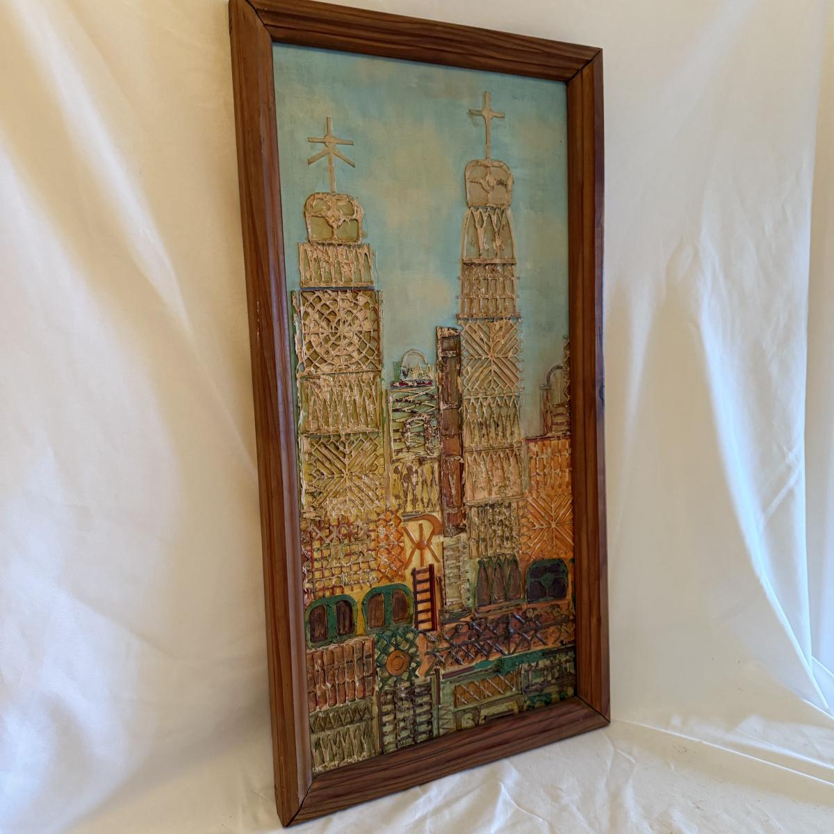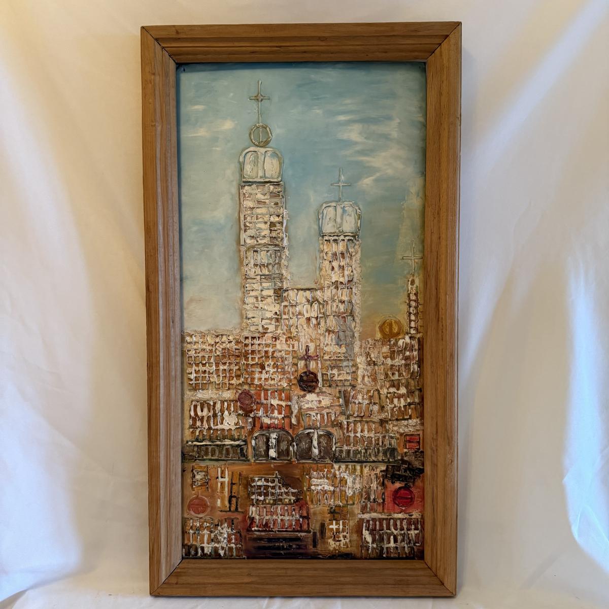 This lot contains two similar style cityscape multimedia paintings. The first measures 16” x 31”. This one is slightly smaller than the other and does have hardware to be hung. It is signed “Romm” in the bottom right corner. The other painting is slightly bigger, it measures 18” x 34”. This one is falling out of the frame a bit and reinforcing it would be recommended. This slightly larger one does not have a signature or hardware to be hung. Shipping available. Shipping can be costly. Please contact our local shipping provider Postage Express with dimensions for a shipping quote prior to bidding. 828-255-9250 or shipping@postageexpressnc.com