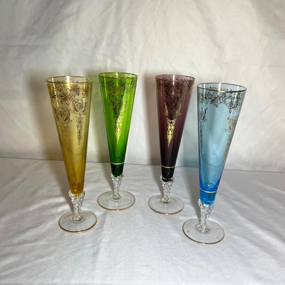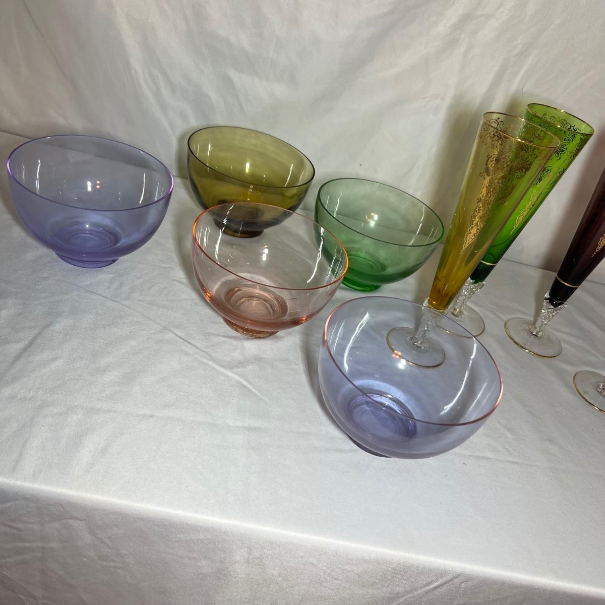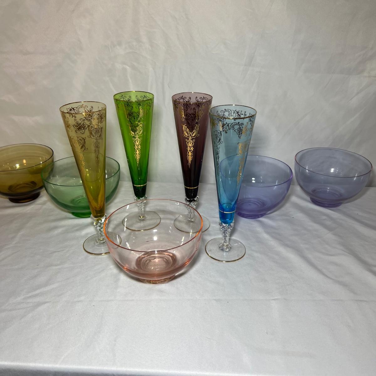 A set of four beautiful delicate champagne flute glasses includes a purple, blue, green and a yellow glass with gold colored accents. Five colored glass dessert bowls also included.