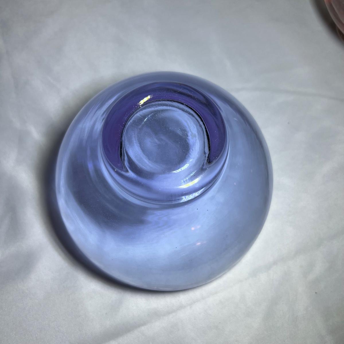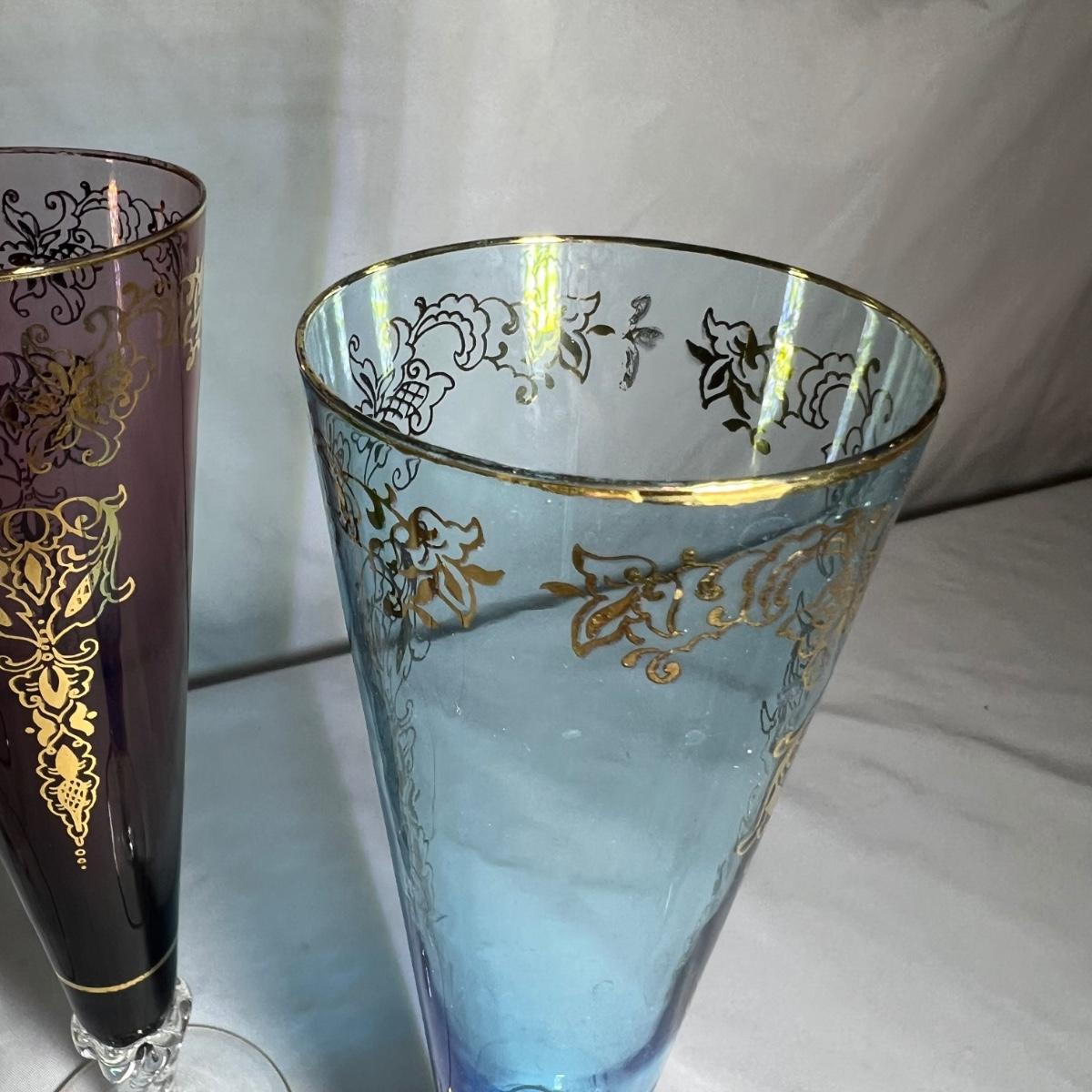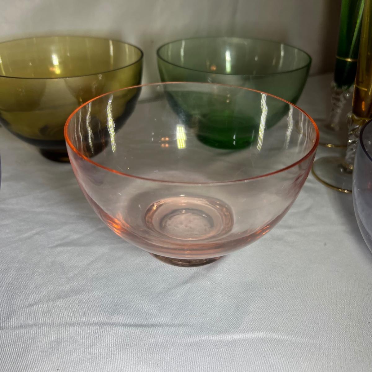 A set of four beautiful delicate champagne flute glasses includes a purple, blue, green and a yellow glass with gold colored accents. Five colored glass dessert bowls also included.
