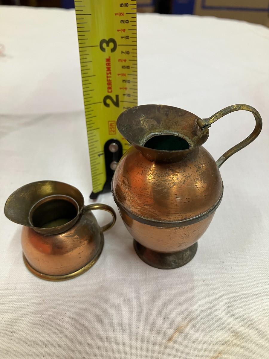 Set of 2 small copper pitchers, measuring 1" and 2"