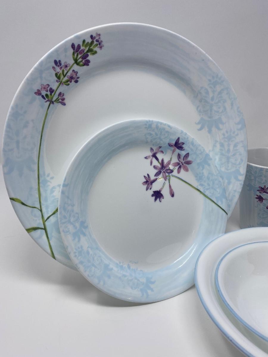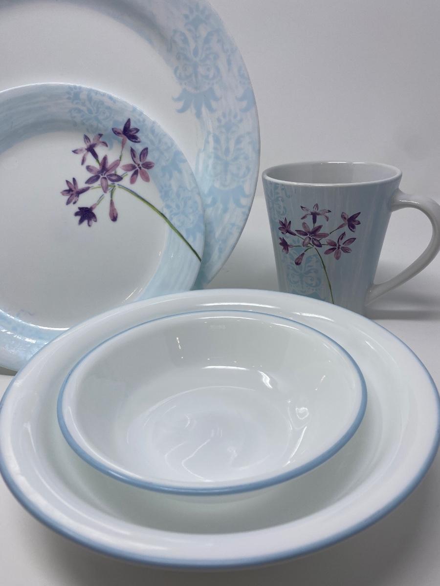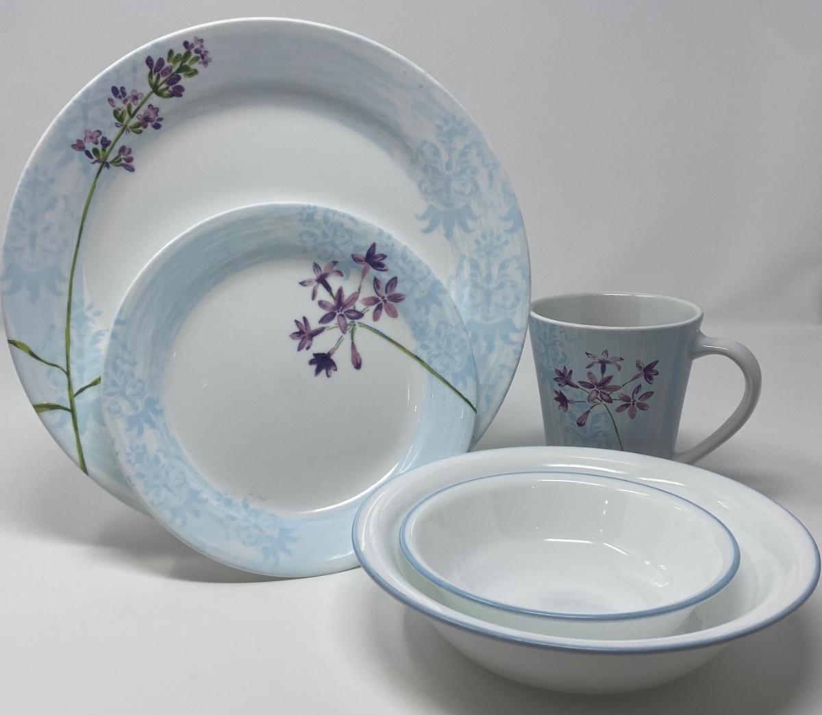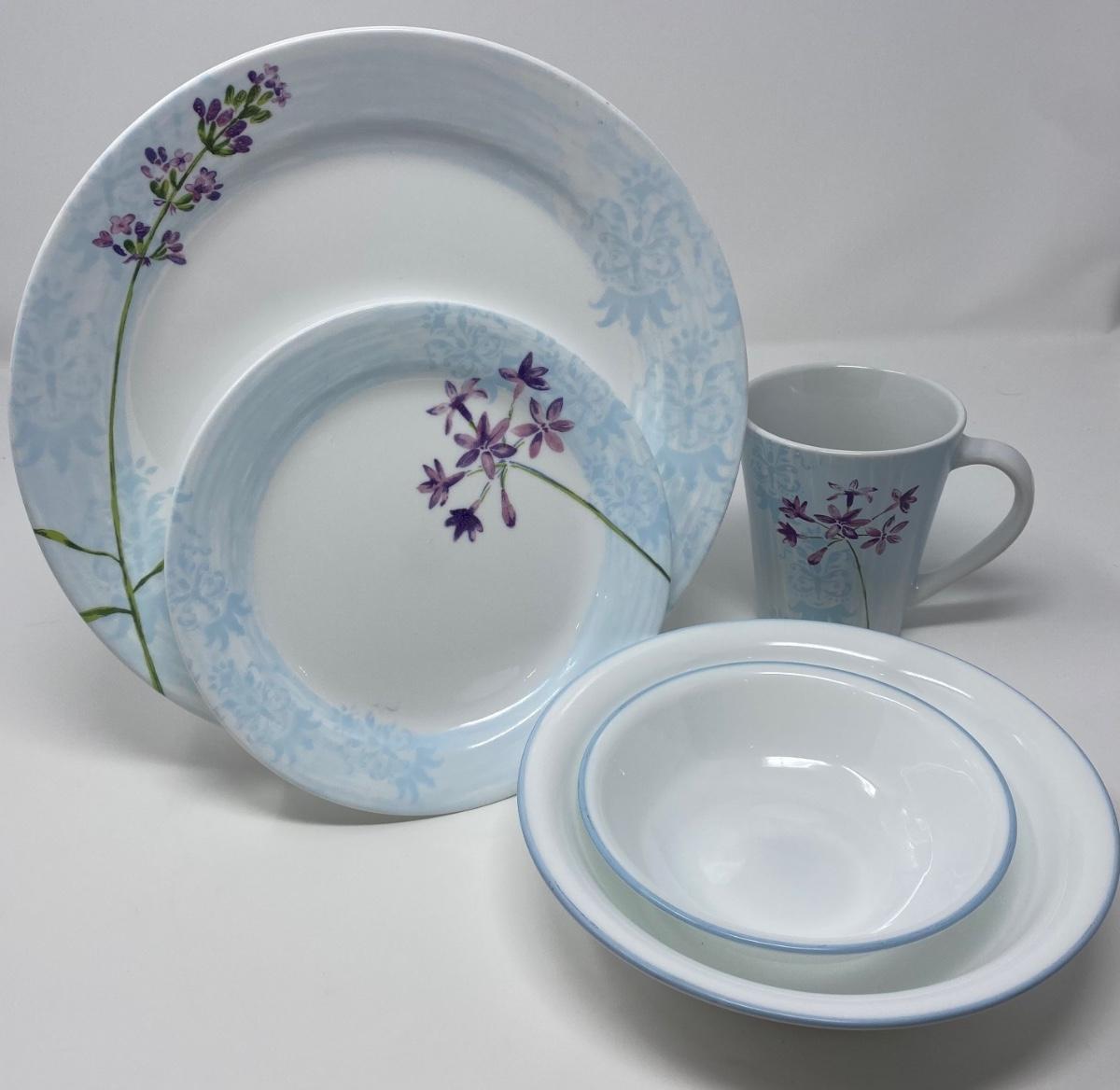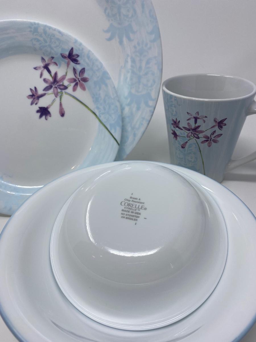 20 Piece Set of Corelle Summer Meadow Dishware Including Four 10.25in Dinner Plates, Four 7.25in Salad Plates, Four 18oz Soup or Cereal Bowls, Four 10oz Dessert Bowls, and Four 11oz Stoneware Mugs