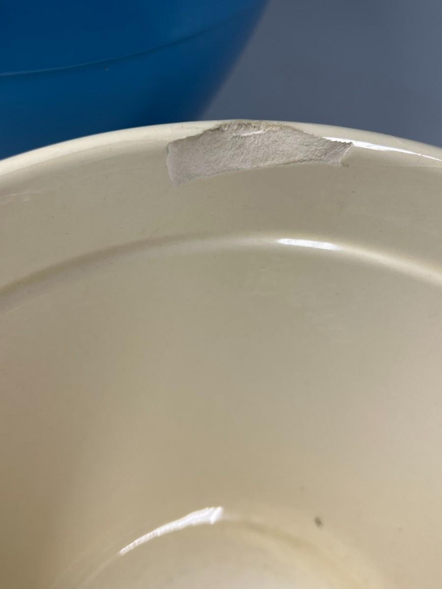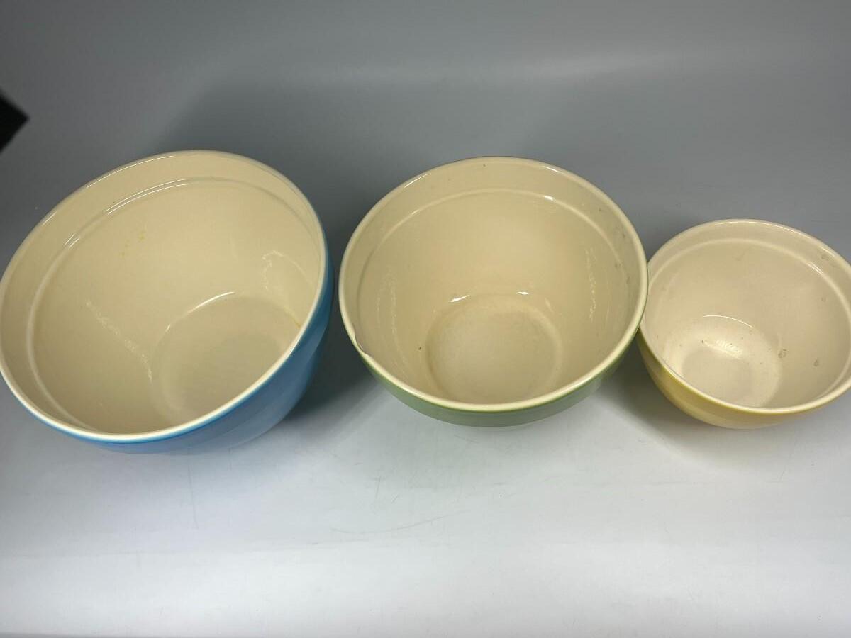 There is a chip to the green bowl pictured above, but there is no other significant damage to the rest of the bowls in the lot and is in overall good useable condition. Check pictures for more details and for sizing.
