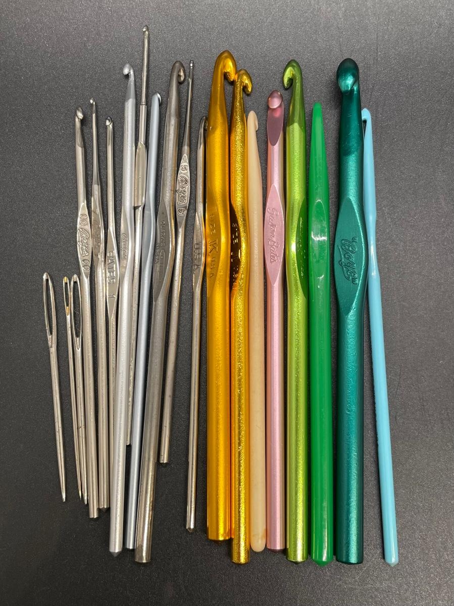 All items are in great condition and have no damages. This set comes with crocheting stainless steel/colorful hooks, a measuring tape, and a red holder. Measuring tape is old, may be better for craft repurpose than use.